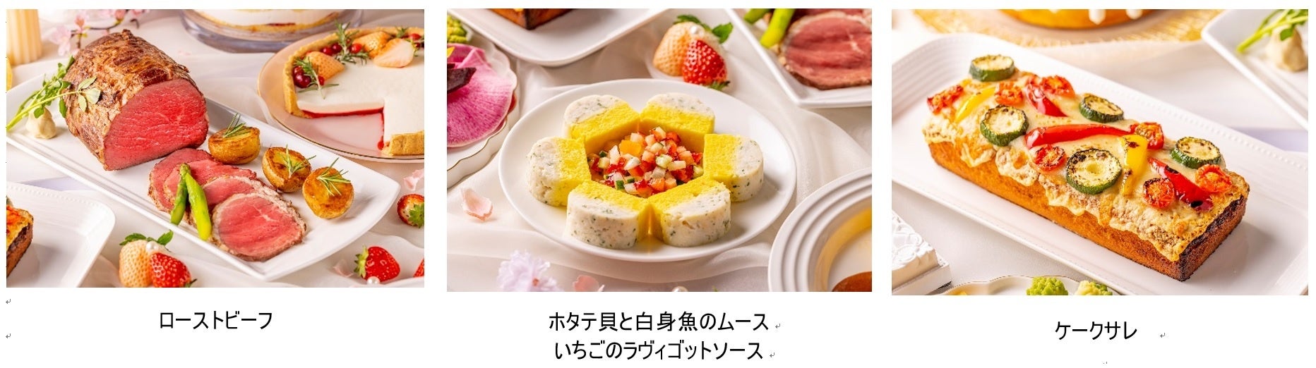 生地に、肉、野菜、チーズを入れて切り口が華やかな「塩味のケーキ」と言われる「ケークサレ」や「ホタテ貝と白身魚のムース いちごのラヴィゴットソース」、「桜海老とそらまめのフリッタータ」、「桜チップのスモークサーモンとブロッコリーのマカロニグラタン」など春の食材を使ったお料理と白いデザートをぜひ、写真におさめて目でもお楽しみください。