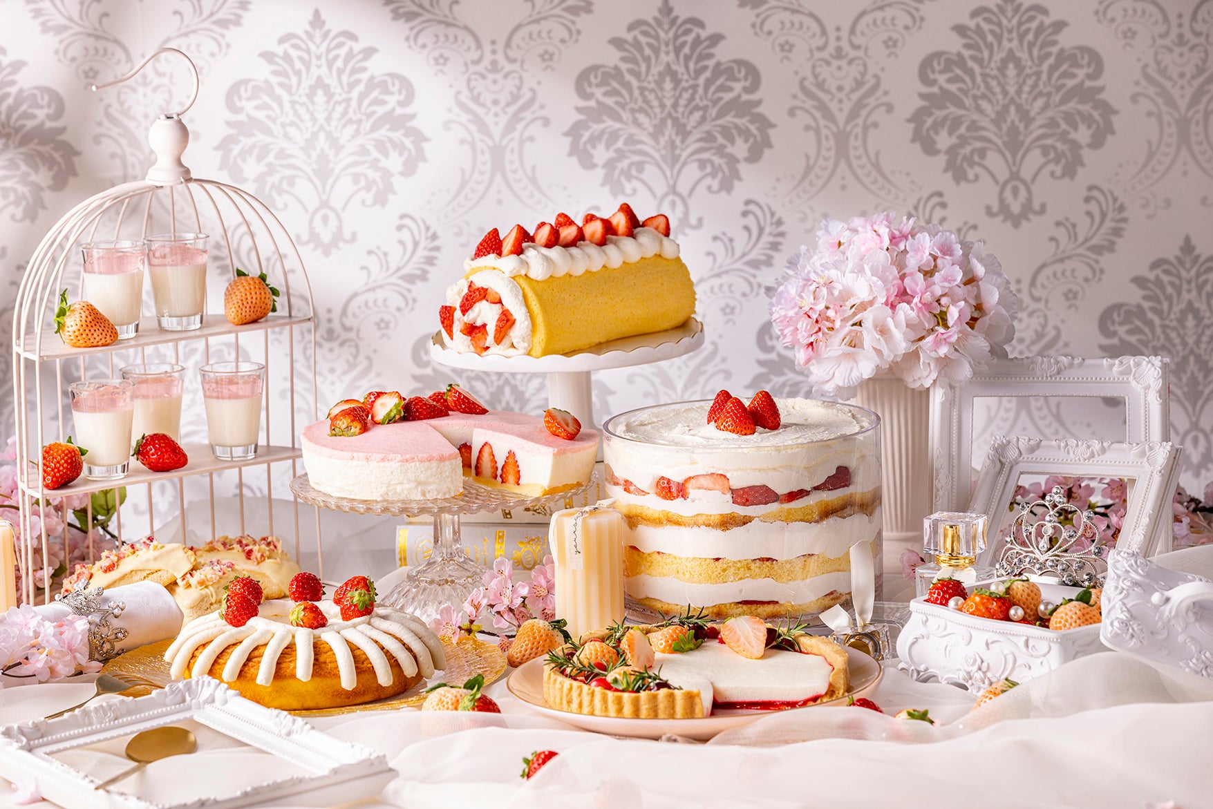 いちごのビッグトライフル、白いちごとレアチーズタルト、ストロベリーロールケーキ、ストロベリーヨーグルトのパンナコッタ 桜のジュレ、いちごと桜のムースケーキ、ストロベリースコーンとホワイトチョコレートほか