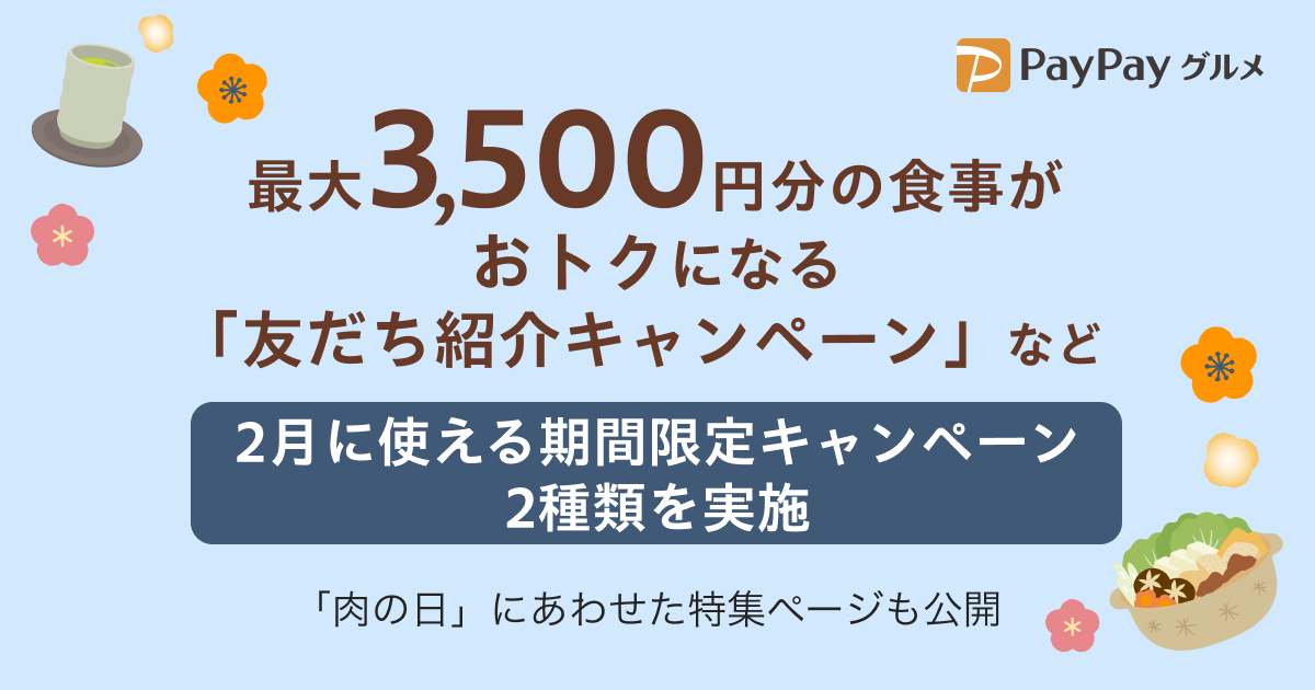ヤフー株式会社(以下、Yahoo! JAPAN)が運営する飲食店予約サービス「PayPayグルメ」は、最大3,500円分の食事がお得になる「友だち紹介キャンペーン」など、2月に使える期間限定キャンペーン2種類を実施しています。