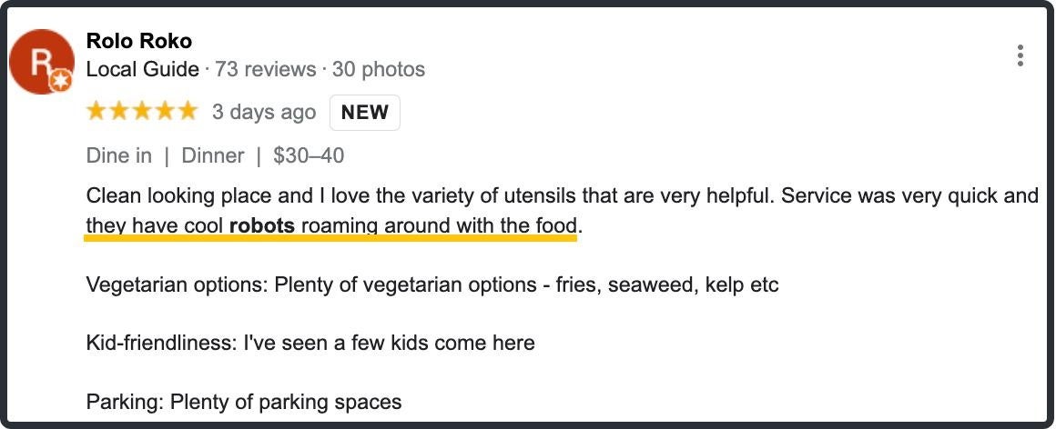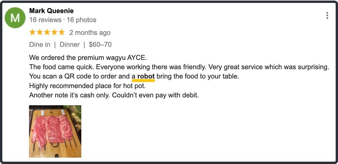 Ushi Shabu Shabuは和風日本料理店で、今まで人手不足など課題が抱えています。それを踏まえ、店内に配膳ロボットが導入されました。意外にロボットを導入していること自体が話題になりました。Google レビューの中、数多くの顧客が「robots」を言及いたしました。それにつれて、ロボットを興味お客様が来店につながりました。来店したお客様がロボットの様子を撮ったし、SNSやレビュー等で発信することで、次のお客様を呼ぶ高い宣伝効果も見込めます。