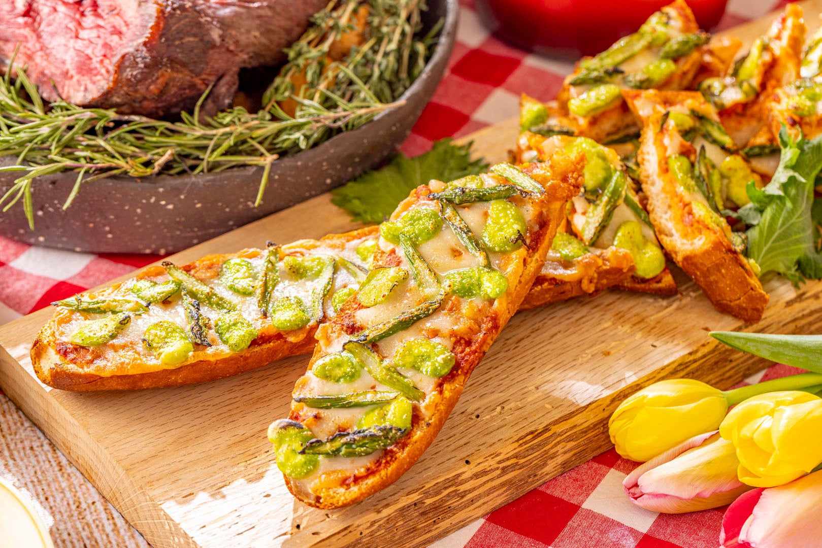 プラントベースミートと春野菜、アスパラガスのラクトベジタリアンタルティーヌ 大葉ソース