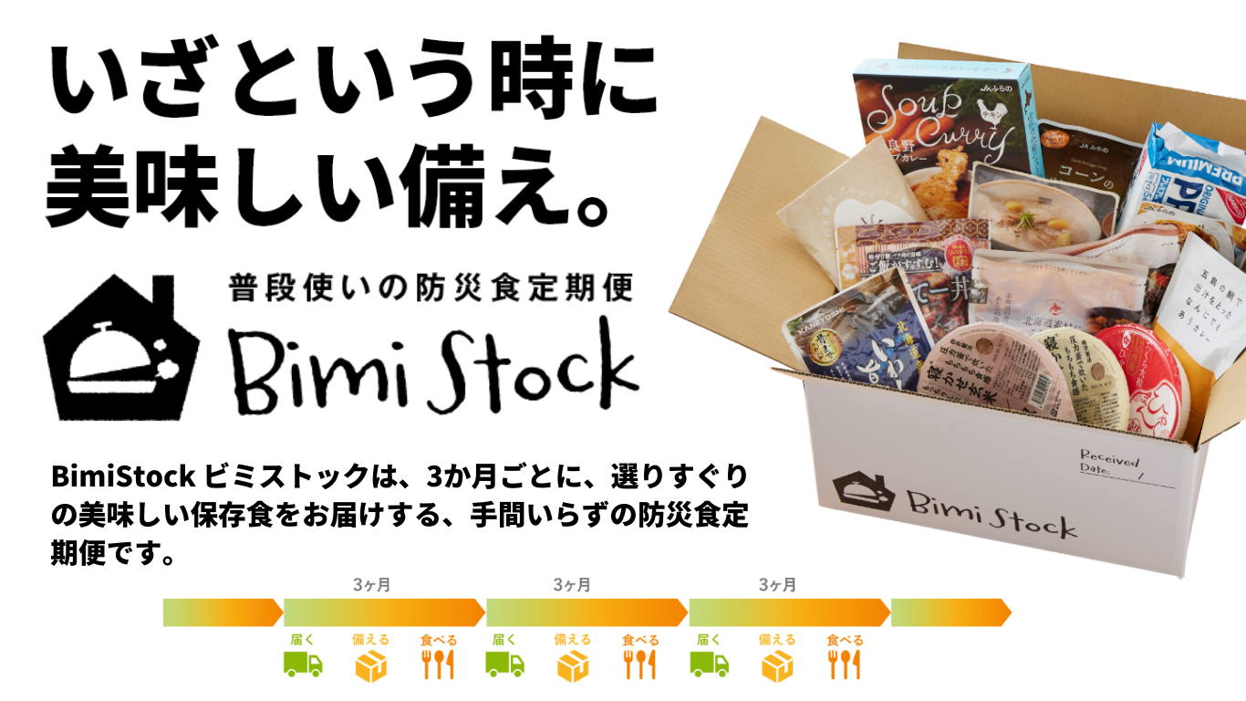「BimiStock」は全国から選りすぐった個性的で美味しい保存食のセット(3食×3日分)を、3ヶ月毎に自動的にお届けする、手間いらずの防災食定期便です。最初の3か月はいざという時に備えて備蓄し、次のセットが届いたら毎日の食卓の一品や時短料理として便利に美味しく食べていただけます。商品は北海道や長崎五島など全国の地方色溢れる食品などを中心に美味しさとワクワク感を基準に厳選。年4回のシーズン毎に新しい味をお届けできるように品揃えしてまいります。無理なく、無駄なく、楽しく、 ”届く・備える・食べる”をサイクルさせるローリングストックで、大切なご家族のためにしっかりと災害に備えていただくことができます。