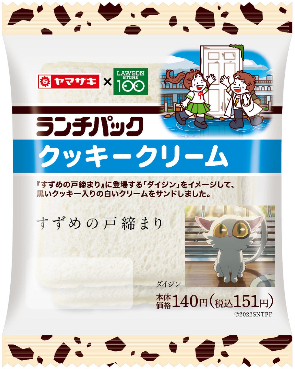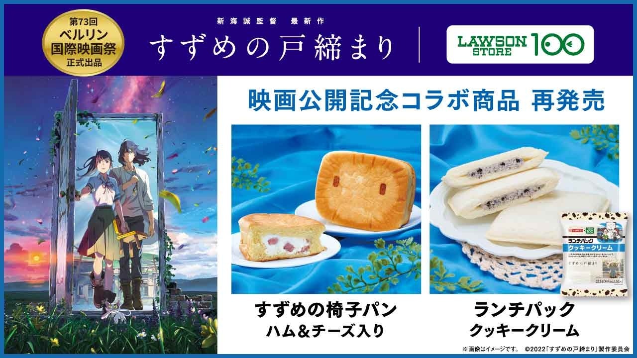 株式会社ローソンストア100(神奈川県川崎市)は、観客動員数1,000万人超えという大ヒットで現在も記録を更新中の新海誠監督・映画『すずめの戸締まり』 の、第73回 ベルリン国際映画祭 コンペティション部門 正式出品を記念して、映画とのコラボレーション商品2品を2023年2月15日(水)に全国のローソンストア100(664店舗/2022年12月末現在)にて再発売を決定。商品は、主人公すずめが一緒に旅をする「すずめの椅子」をモチーフにした「すずめの椅子パン(ハム&チーズ入り)」と、人の言葉を話す謎の白い猫”ダイジン”をイメージした「ランチパック(クッキークリーム2個入り)」の2品で、映画の公開を記念して2022年11月16日(水)から3週間限定で販売されたものです。
