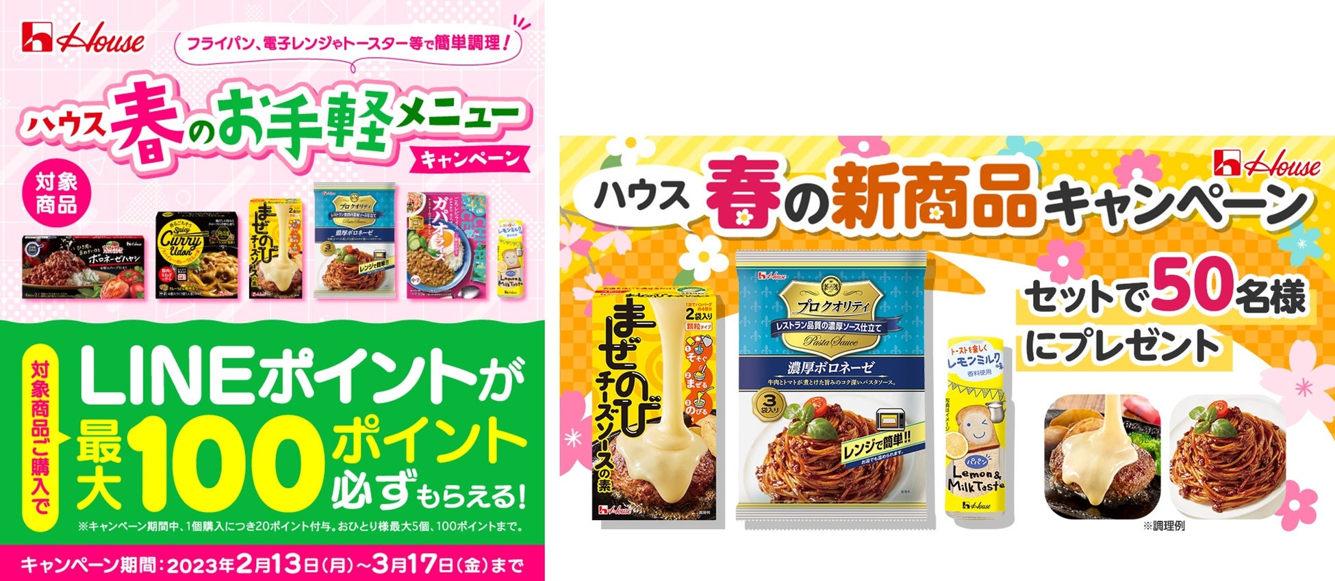 ハウス食品は、“フライパンや電子レンジ、トースターなどで簡単調理ができる対象商品(全18アイテム)”の購入レシートで応募ができ、「LINEポイント」が最大100ポイントもらえる『ハウス 春のお手軽メニューキャンペーン』を、2月13日から開始します。