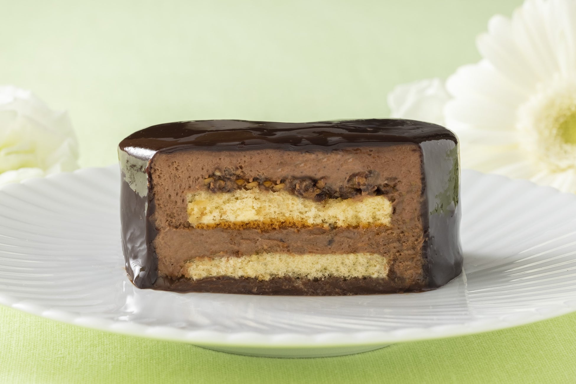 生チョコの上にスポンジ、プラリネショコラムース、チョコ掛けアーモンドクランツを重ね、グラッサージュショコラをかけて苺を飾りました。