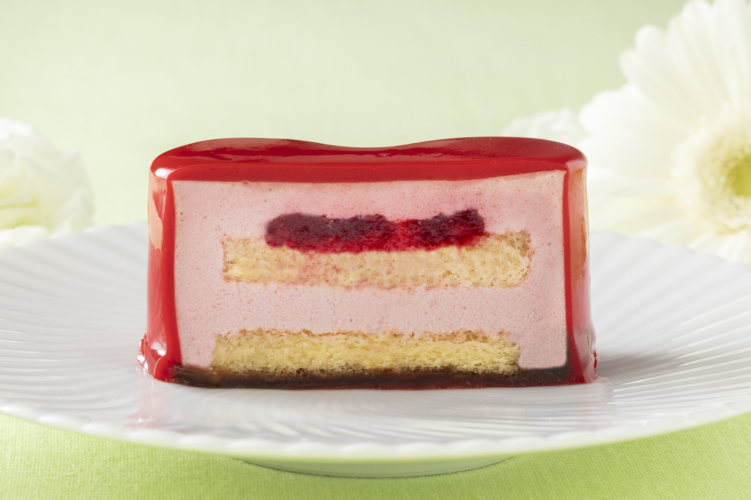 生チョコの上にスポンジ、苺とフランボワーズのベリームース、果肉入りフランボワーズジュレを重ね、真っ赤なグラッサージュをかけて苺を飾りました。