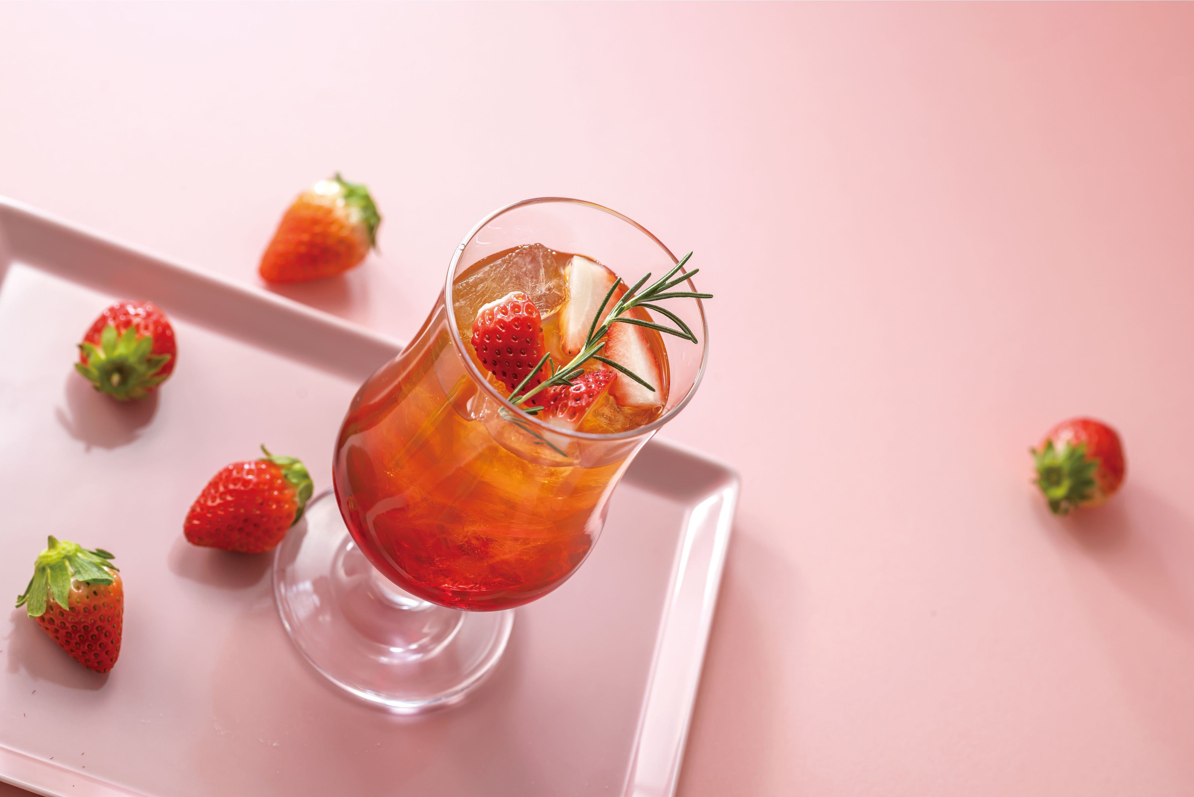 いちごフレーバーのアイスティ。よく混ぜていちごの甘さとローズマリーの爽やかな香りをお楽しみください。