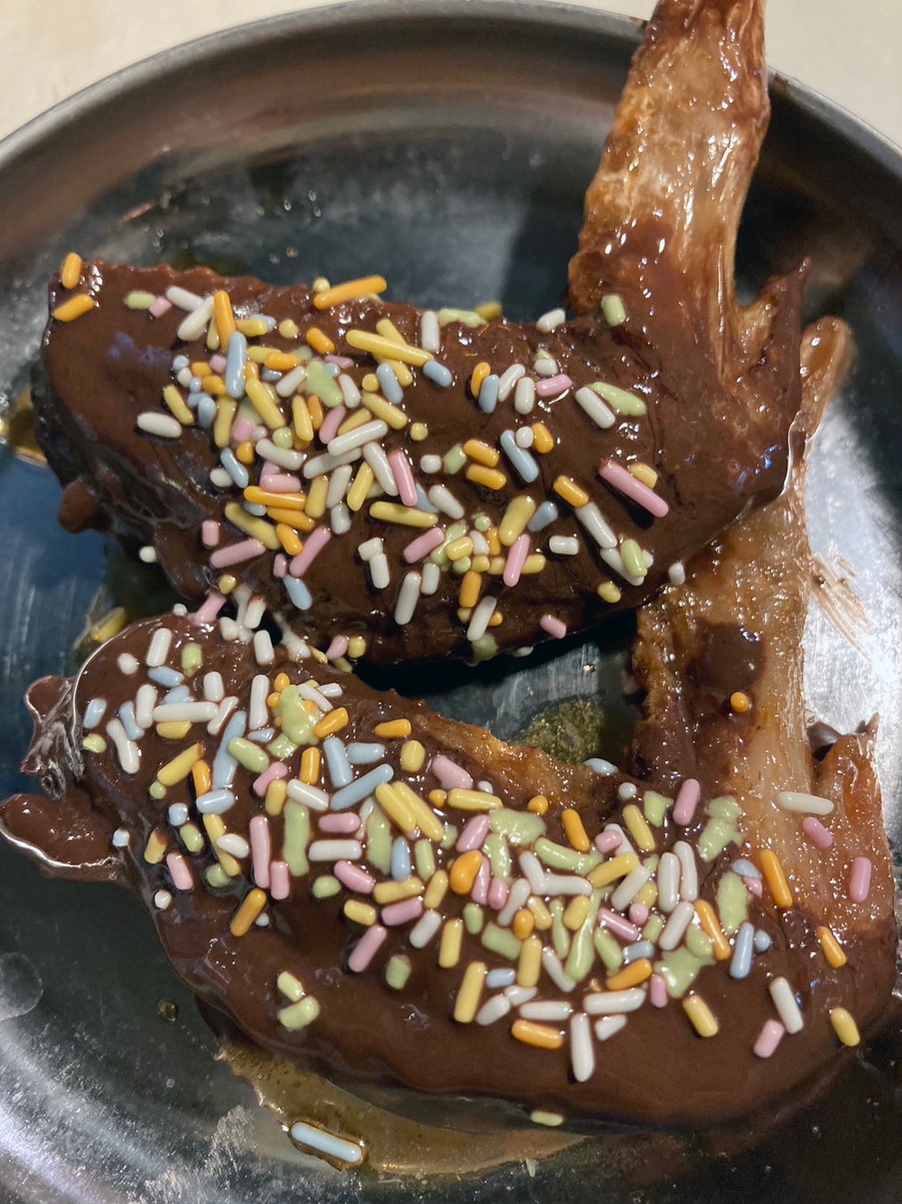 料理概要: 「伝説の手羽先」をチョコレートでコーティングしてカラフルシュガーでデコレーション