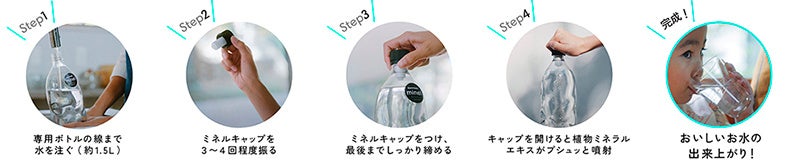 専用ボトルに水道水や浄水などの飲用水を線まで(約1.5L)入れ、キャップを装着してひねるだけで、“植物ミネラルエキス”がプシュッと爽快な音とともに噴射され、一瞬でボトルの中の水が新たなおいしさに変わります。