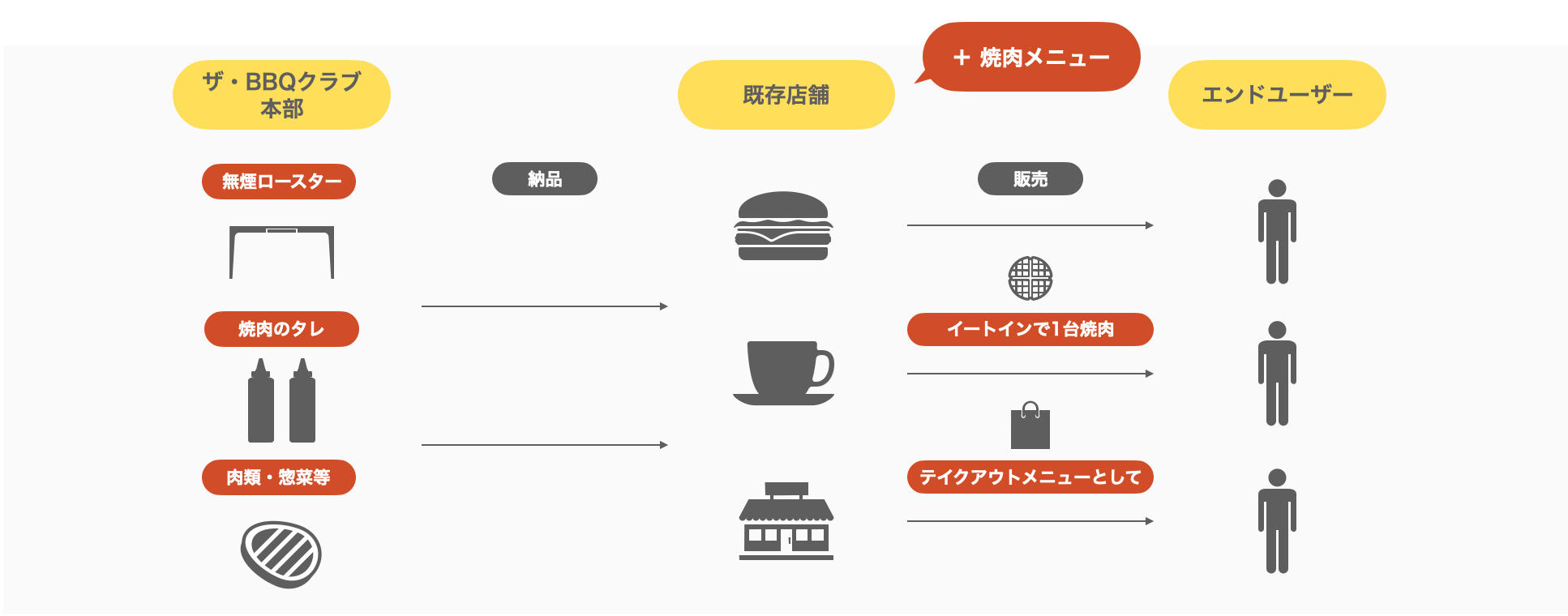ザ・BBQクラブを導入することで、加盟店様限定の販売サイトにて、有名焼肉店のタレ・食材を購入、販売することができます。第 一弾は都内に7店舗展開する焼肉店「うしくろ」。ブランドは随時追加されていく予定となっております。