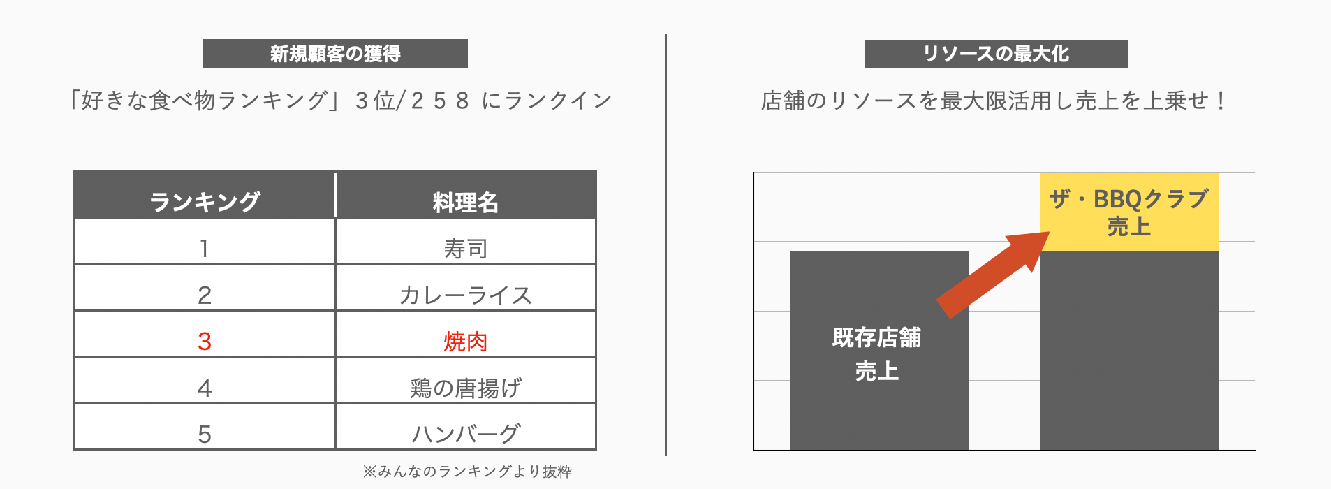 ザ・BBQクラブを導入することで、焼肉目的の新規顧客の獲得に加え、店舗リソースの最大化が期待できます。