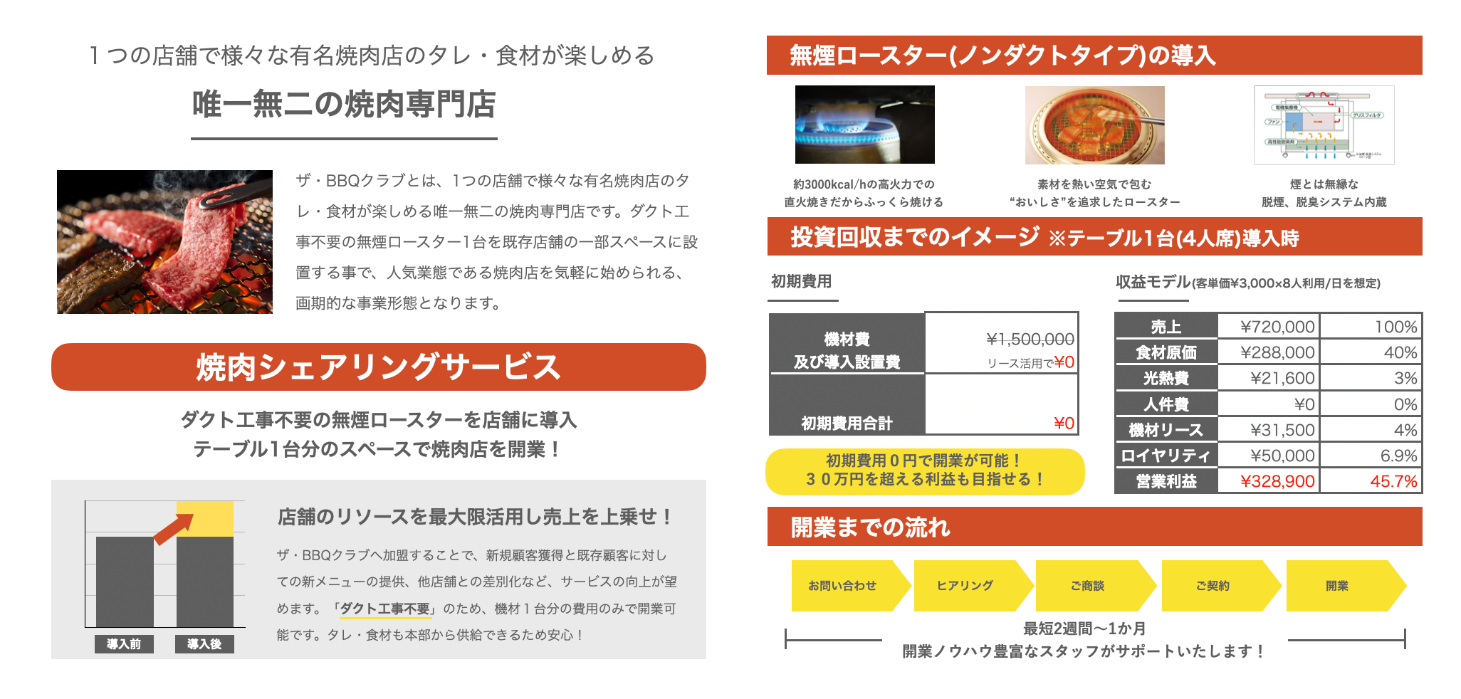 工事の必要のない無煙ロースターを店舗に導入することで、テーブル1台分のスペースで誰でも焼肉店を開業できます。既存店舗の中に2つの業態を置くことで、更なる売上増加と客単価の向上が望めます。ロイヤリティも固定のためランニングコストが低く、運営のしやすいモデルとなっています。