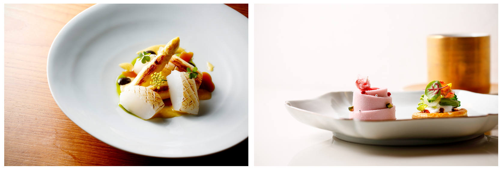 (画像左)ホワイトアスパラガスと烏賊 オランデーズソースとトリュフ