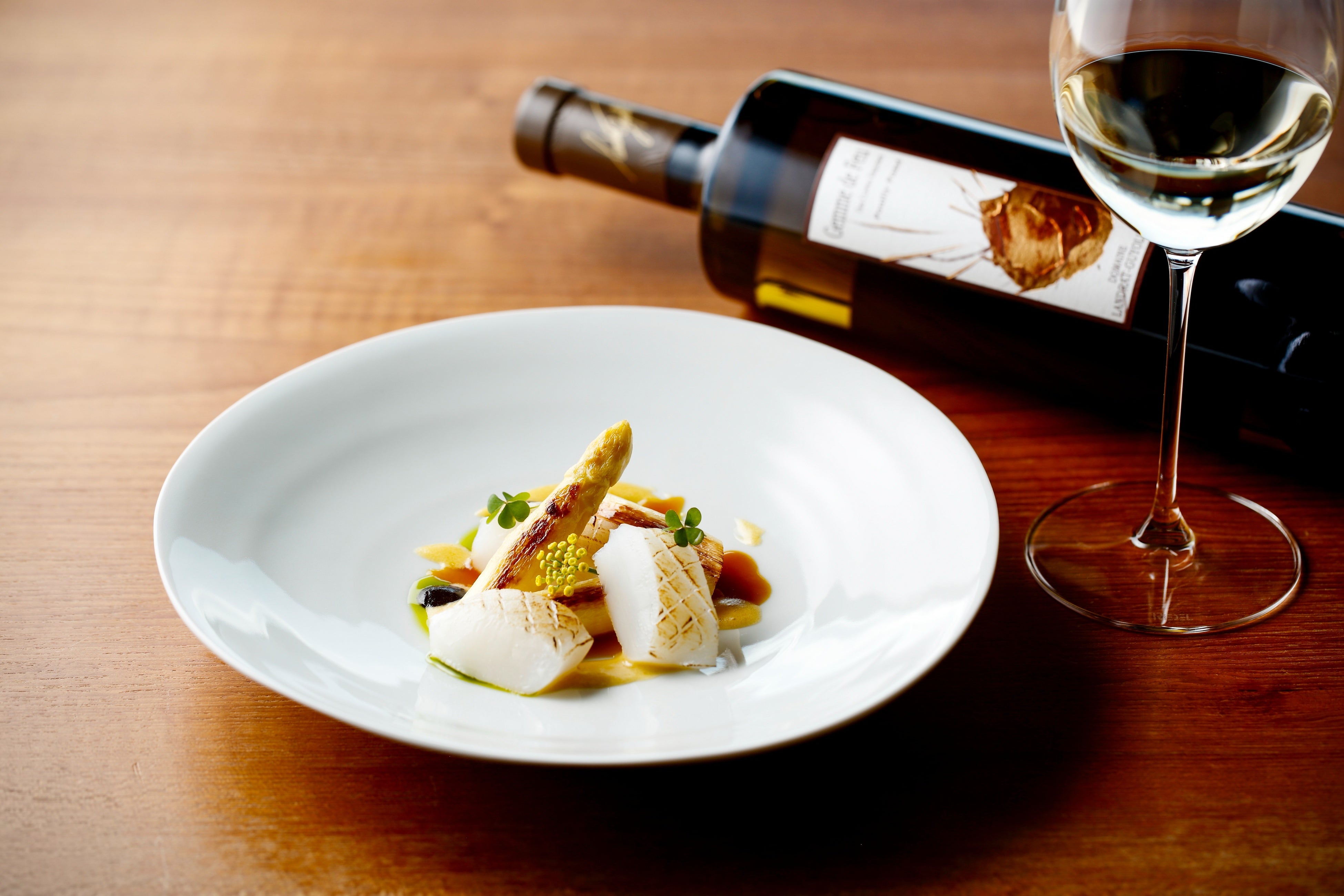 アスパラガスの心地よい苦みとオランデーズソースの甘味にシェリービネガーとトリュフを合わせた濃厚な香りの贅沢なソースが調和し、しゃきっとした歯ごたえに烏賊の食感もお楽しみいただけます。
