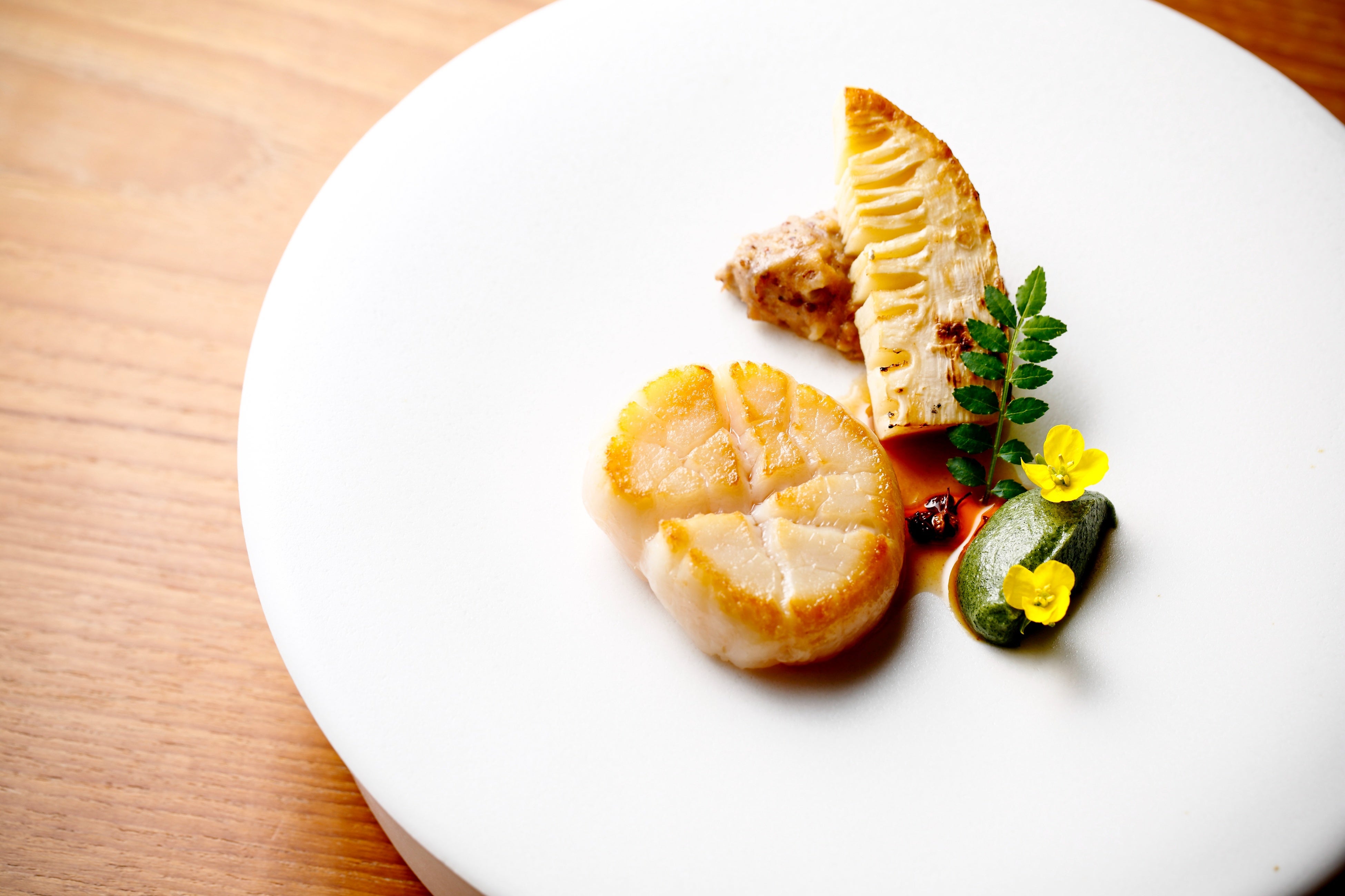 帆立貝と豚足に旬の筍という海と山の食材が出会い、それぞれの個性的な味わいを仔牛のジュを使ったヴィネグレットと木の芽や花山椒の香りが取りまとめる一品です。