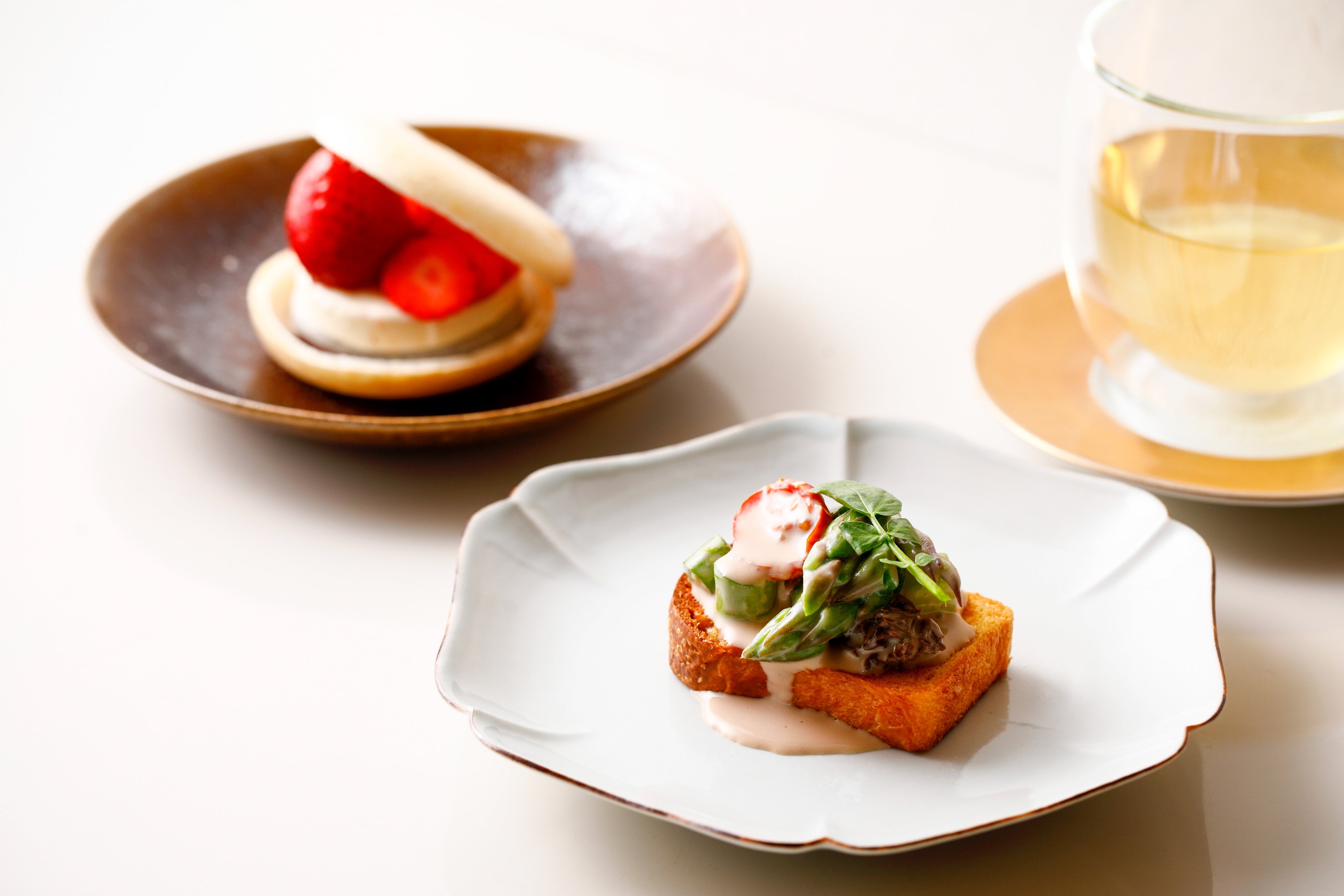 「自家製ブリオッシュ アスパラガスとモリーユ茸のフリカッセ」 、「苺大福 最中」/ ニホンノスコヤカ ブレンド 井入農園 滋賀