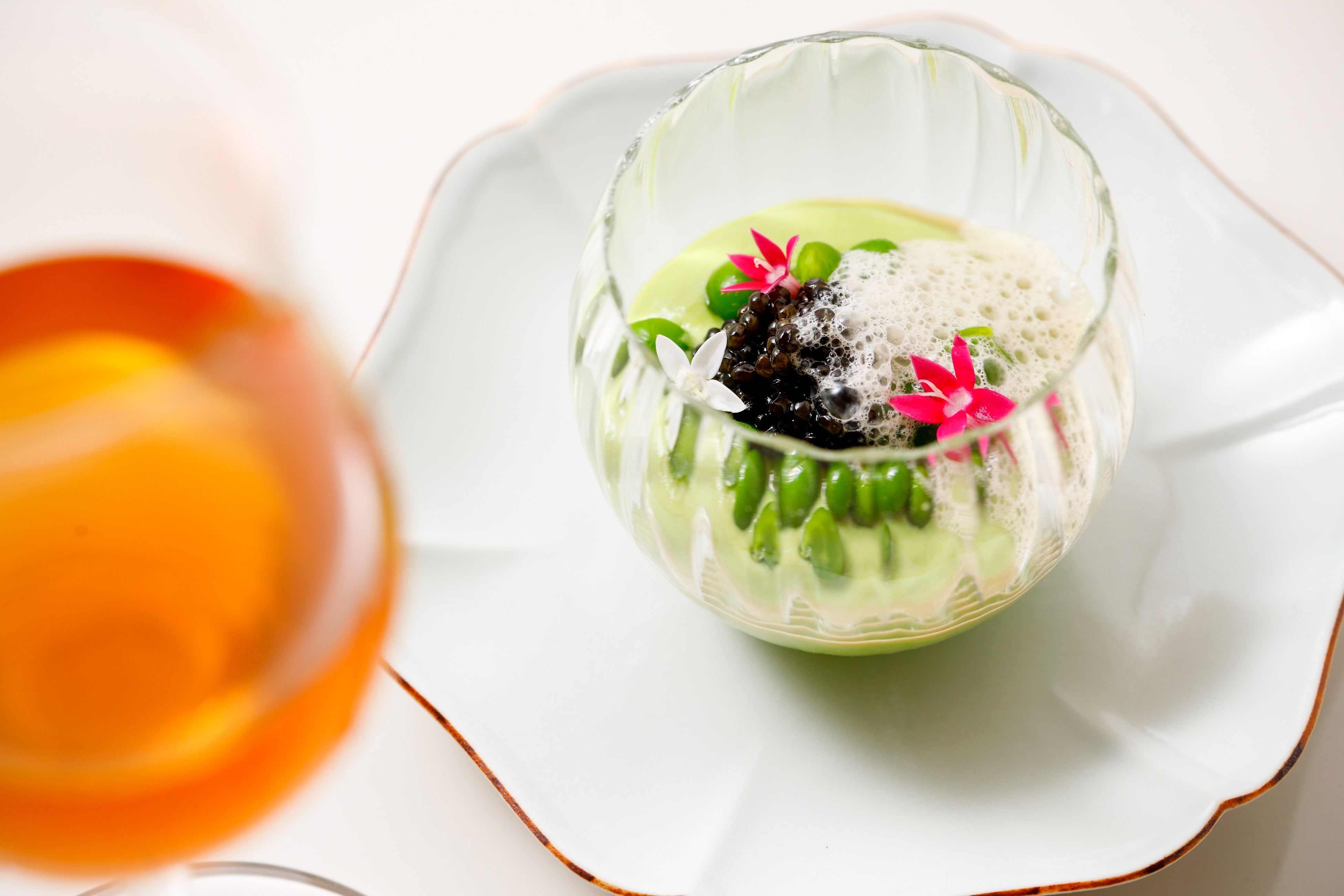 コース最初のディッシュは、えんどう豆をムースにキャビア、酸味の効いた白ワイン風味の泡で軽やかに仕上げた一皿です。