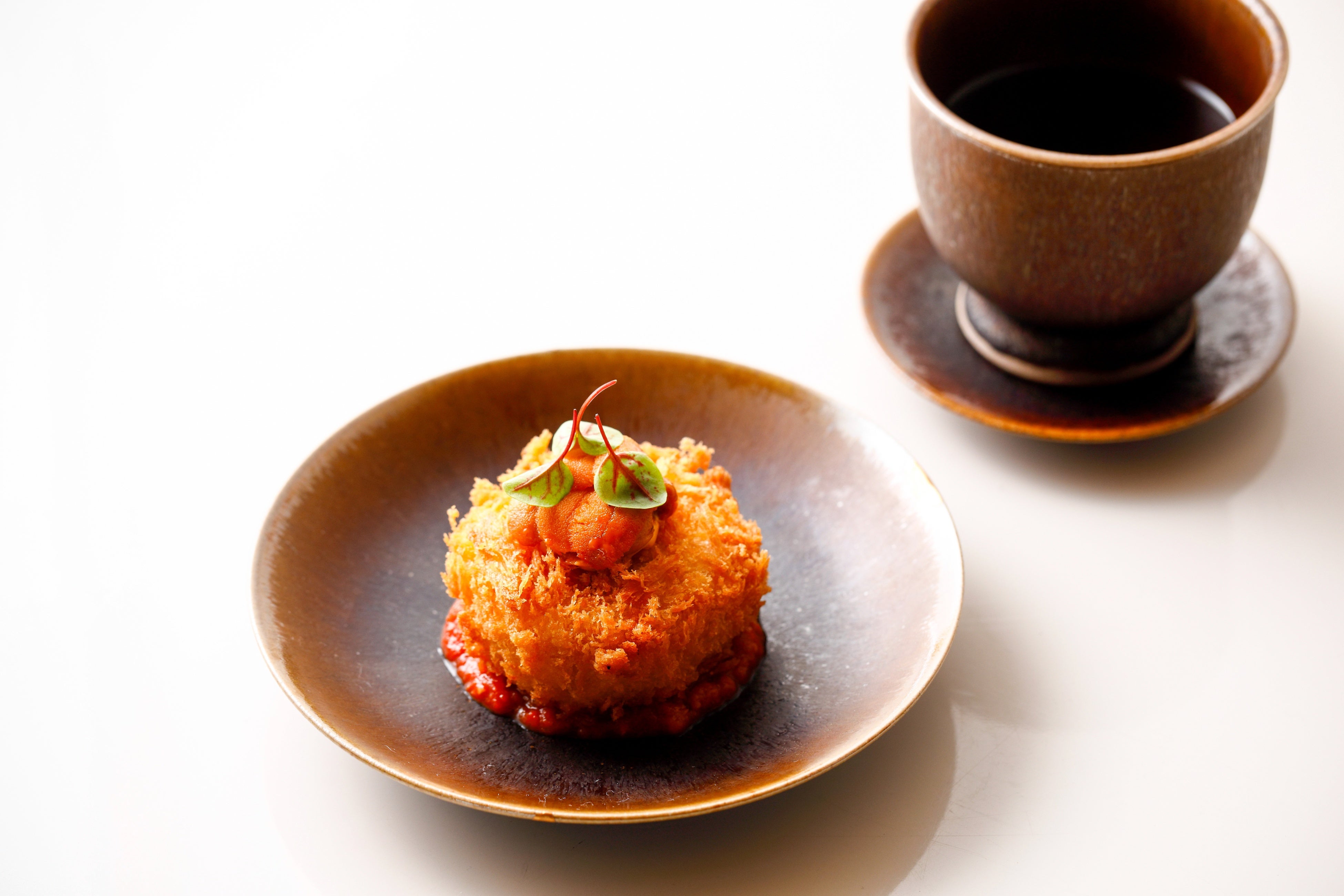 桜海老と筍の玄米リゾットをクロケット仕立て、サフラン風味のアイオリソースと生雲丹を添えました。