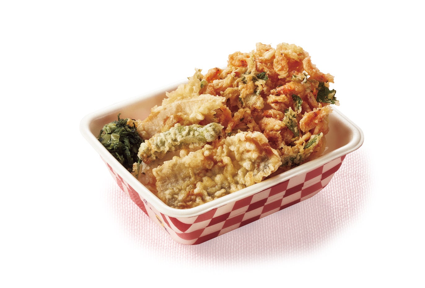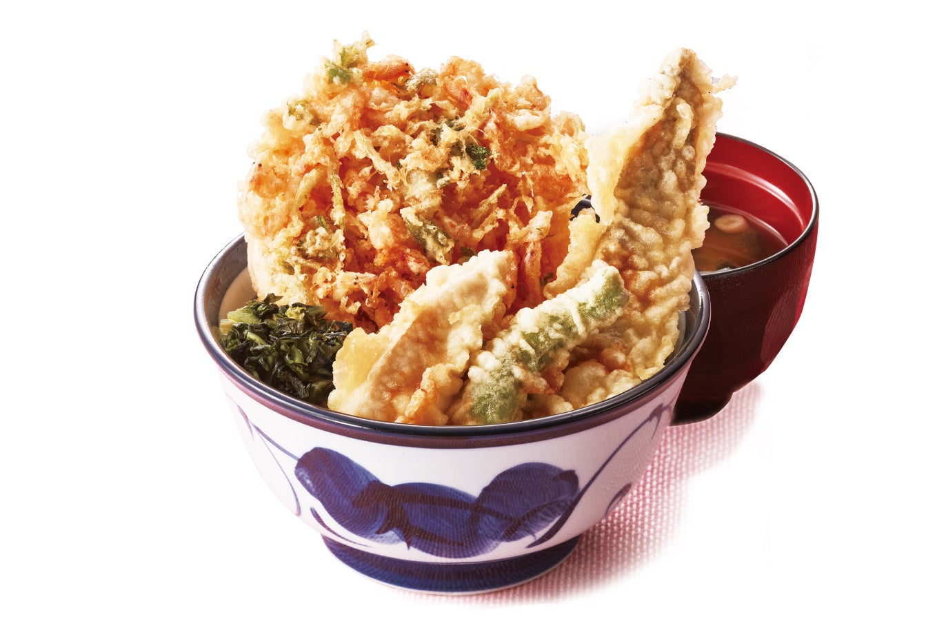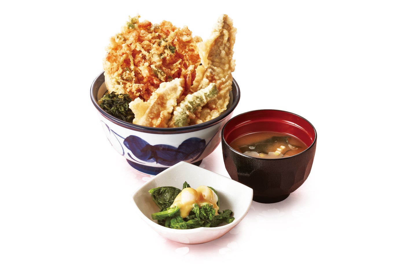 香ばしくサクサクと軽い仕上がりの「桜海老のかき揚げ(三つ葉入り)」、ほどよい歯ごたえで天ぷらによく合う春野菜の「たけのこ」、鮮やかな緑色の「ししとう」、ふんわりした「国産太刀魚」の天ぷらをのせ、さっぱりとした「広島菜(青じそ風味)」を添えました。春の訪れを存分に感じられる天丼です。