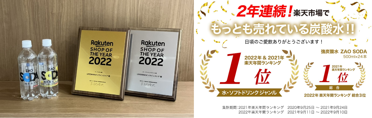 株式会社ライフドリンク カンパニーが運営する「LIFEDRINKオンラインストア 楽天市場店」は「楽天ショップ・オブ・ザ・イヤー2022」の「水・ソフトドリンクジャンル賞」「ラ・クーポン賞」を受賞しました。「楽天ショップ・オブ・ザ・イヤー」の受賞は店舗オープン初年度から3年連続となります。また、同ショップで販売している「強炭酸水 ZAO SODA」は2年連続で楽天年間ランキング「水・ソフトドリンクジャンル賞」(水・ソフトドリンクジャンル第1位)を受賞しています。