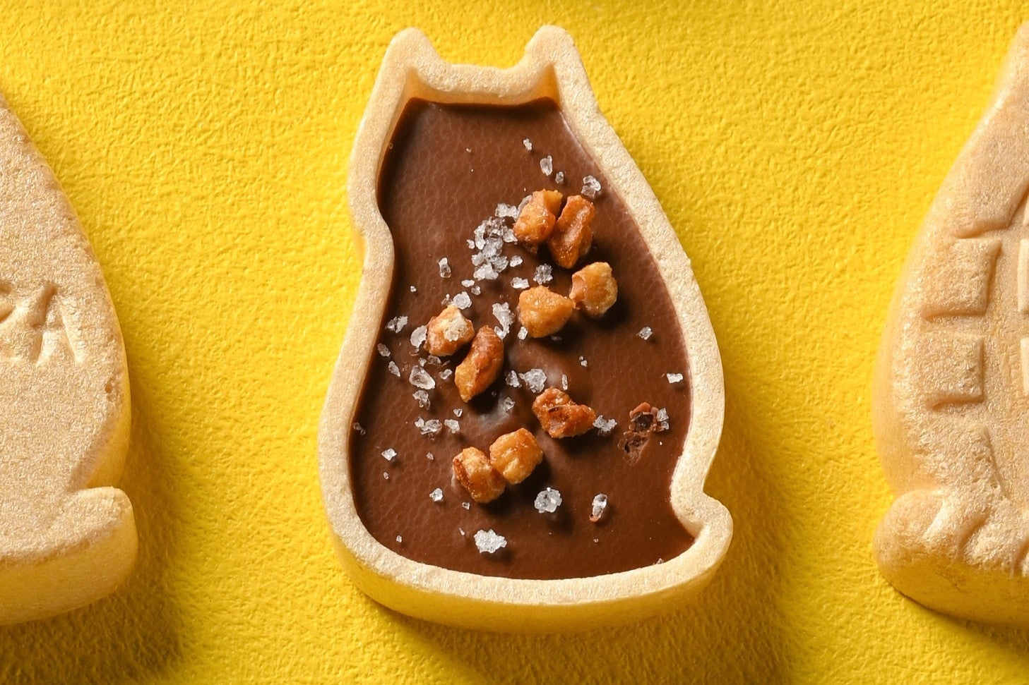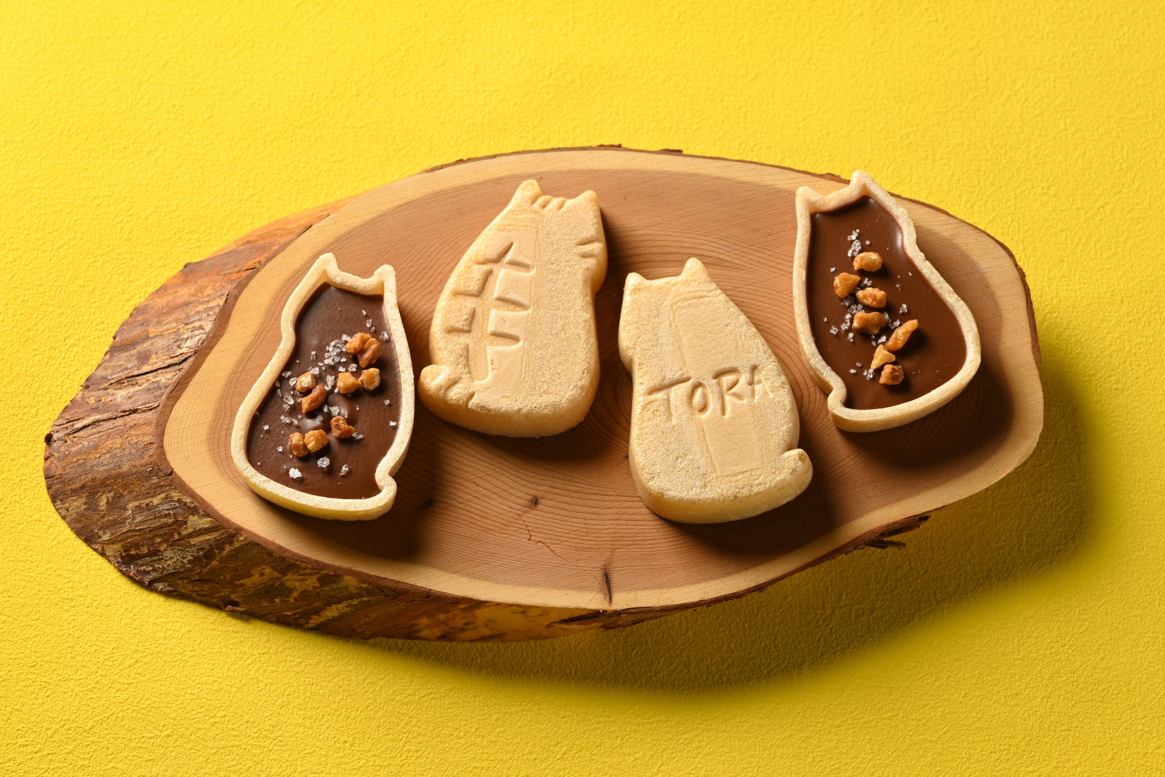 にゃんこ「トラ」をかたどったモナカ種(だね)に、チョコレートを流し込み、くるみと能登塩をトッピングしました。
