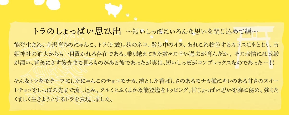 数々の辛い過去を乗り越えて強くたくましく生きる姿をお菓子で表現しながら、パッケージにはトラの過去や「人(猫)となり」が垣間見えるエピソードをご紹介しています。