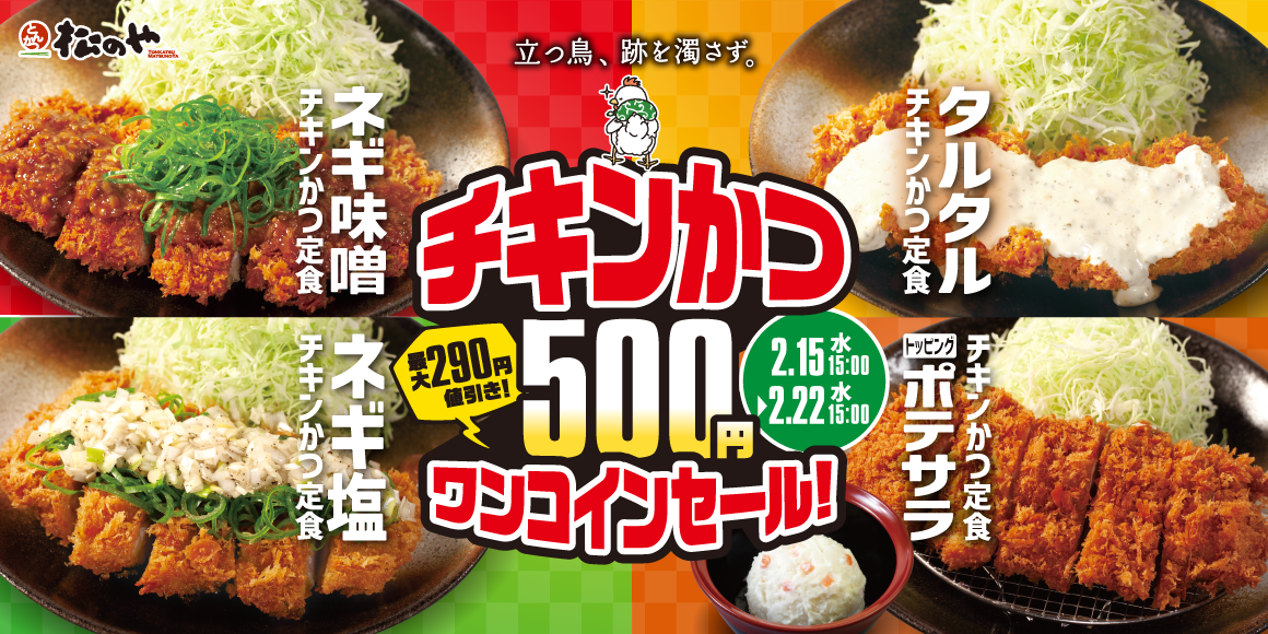 2023年の松のやがアツい!今年2回目のワンコインセールの主役は、やわらかジューシーな「チキンかつ」。青唐辛子・ニンニク風味の濃厚味噌ダレ「ネギ味噌」、風味豊かな香草をたっぷり使用した松のや定番「タルタルソース」、たっぷりネギの塩ダレと梅肉を添えた「ネギ塩」の3種類のトッピングがすべて500円!さらに、チキンかつ定食にはトッピングポテトサラダが付いてワンコインでご提供いたします。