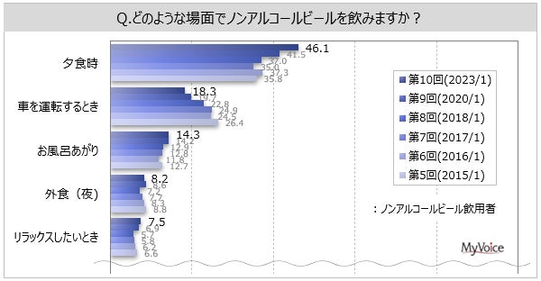 ノンアルコールビールの飲用場面は(複数回答)、「夕食時」が飲用者の46.1%、「車を運転するとき」「お風呂あがり」が各10%台となっています。2017年調査以降、「夕食時」は増加傾向です。『アサヒヘルシースタイル』『からだを想うオールフリー』主飲用者では、「夕食時」の比率が高くなっています。
