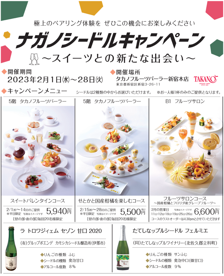 株式会社フルタイム(本社:東京都目黒区、代表取締役社長:渡邉 匠)は、長野県と連携しナガノシードルの認知向上とシードルとの出会いの機会創出を目的としたナガノシードルキャンペーンを2月1日(水)より、首都圏飲食店10店舗とコラボレーションして開催中です。「スイーツとの新たな出会い」と題して、各店舗のスイーツとナガノシードルをセットで提供し、スイーツとシードルのペアリングを提案していきます。