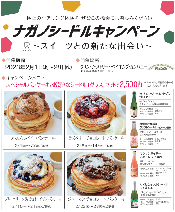 今回のキャンペーンでは首都圏飲食店10店舗にご協力いただき、各店舗のスイーツとナガノシードルをセットで提供し、スイーツとシードルのペアリングにより、シードルを楽しんでいただく新しいシーンを発見していただきます。すでに2月1日(水)よりタカノフルーツパーラー新宿本店とクリントン・ストリート・ベイキング・カンパニーではキャンペーンがスタートしており、多くのお客様にシードルとのペアリングを楽しんでいただいております。
