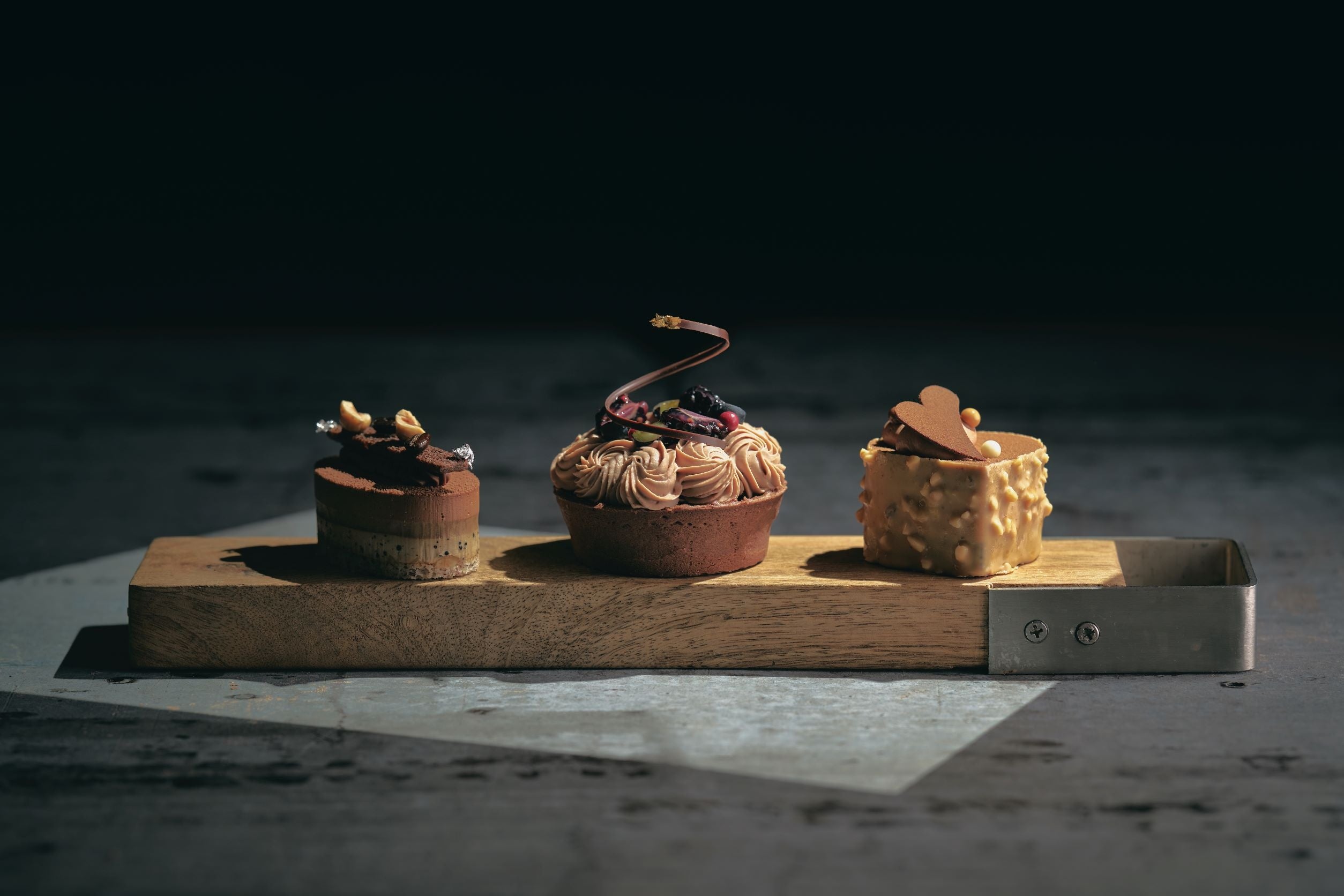 ブロンドチョコレートやホワイトカカオなどのショコラに洋梨やコーヒー、オペラに見立てたモンサンクレールオリジナルのブレンドティーを合わせ、カカオの味わいを最大限に引き出した3種類のケーキを作りました。