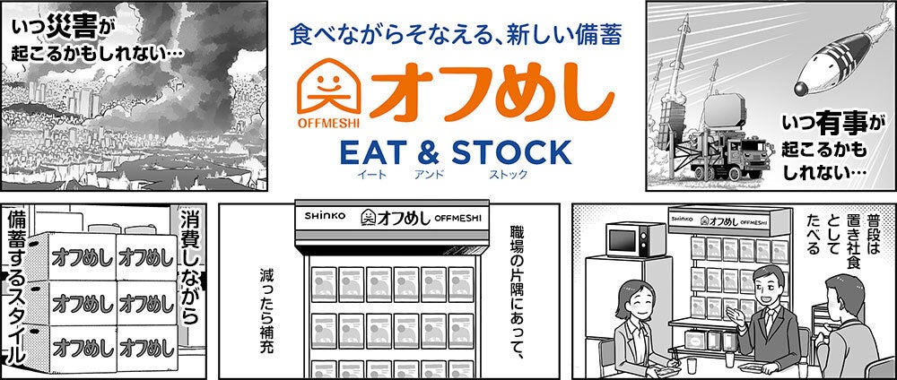 - 常温保存そうざいをローリングストックする「オフめしイート&ストック」:https://www.shinko-jp.com/offmeshi/eat-and-stock/