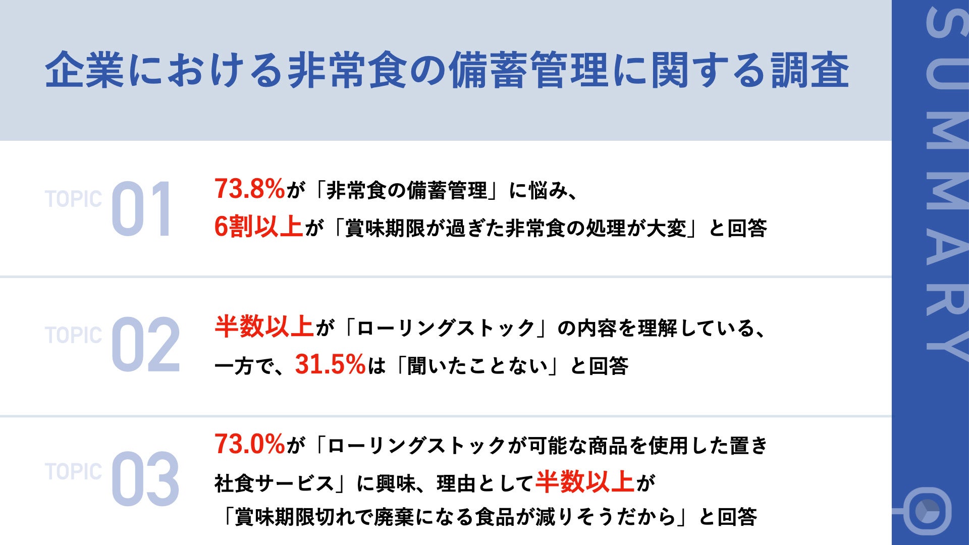 まず、総務担当者の73.8%が、「賞味期限が過ぎた非常食の処理」や「備蓄の適正量の見極め」、「日頃の非常食の管理」といった、「非常食の備蓄管理」に悩みを抱えていることが分かりました。また、「ローリングストック」という普段食べている食品を少し多めに買い置きして、食べたらその分を買い足す備蓄方法について、50.5%が「内容を理解している」と回答した一方で、31.5%は「聞いたこともない」という実態が明らかとなりました。