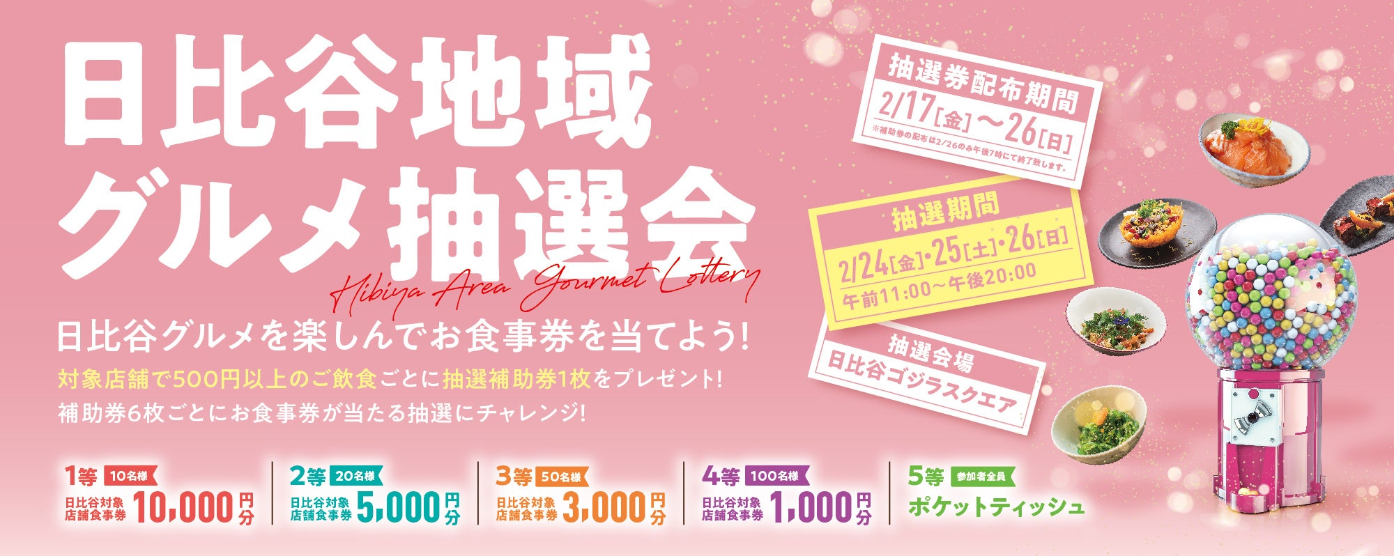 2月24日(金)・25日(土)・26日(日) 11時~20時まで3日間開催される抽選会(会場:日比谷ゴジラスクエア)にご来場いただくと、抽選で日比谷地域のお食事券(店舗指定アリ)が最大合計180名様に当たる企画です。