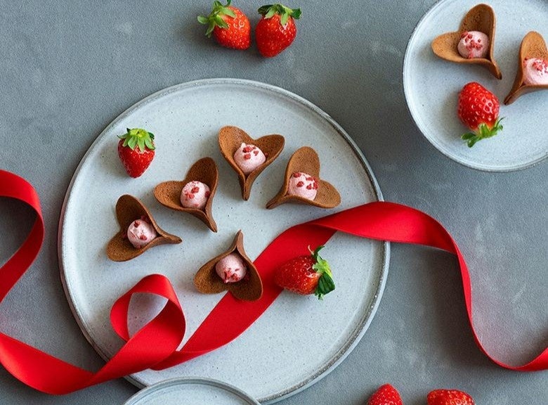 ココアを混ぜ込んだサクサク食感のラングドシャ生地に、芳醇な苺の香りと甘酸っぱいラズベリーのミックスクリームを添えました。贈り物にぴったりな華やかな味に仕上げました。