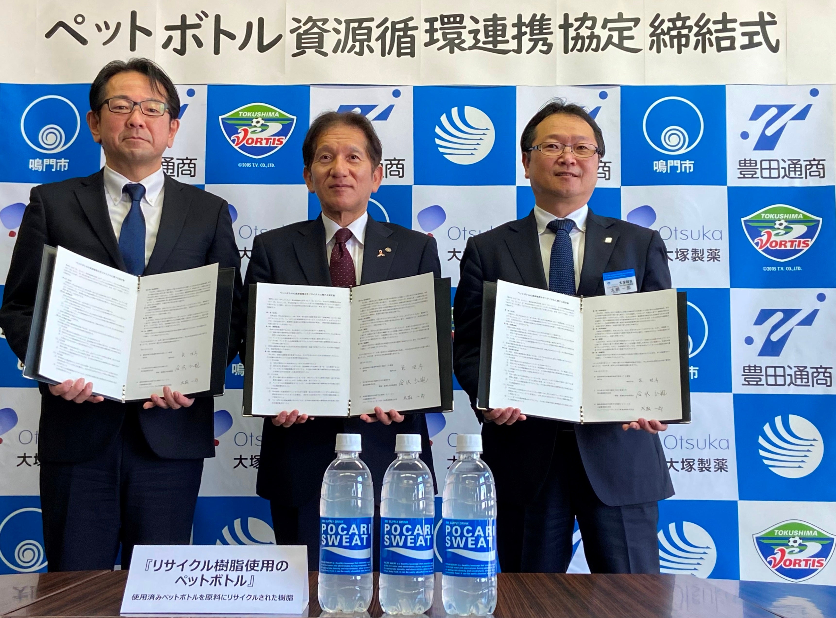 大塚製薬株式会社(本社:東京都、代表取締役社長:井上 眞、以下「大塚製薬」)は、徳島県鳴門市(市長:泉 理彦)、豊田通商株式会社(本社:愛知県、取締役社長:貸谷 伊知郎)の3者で、ペットボトルの水平リサイクル「ボトルtoボトル」を推進し、持続可能な社会を実現することを目的として、2月9日に資源循環のための連携協定を締結しました。