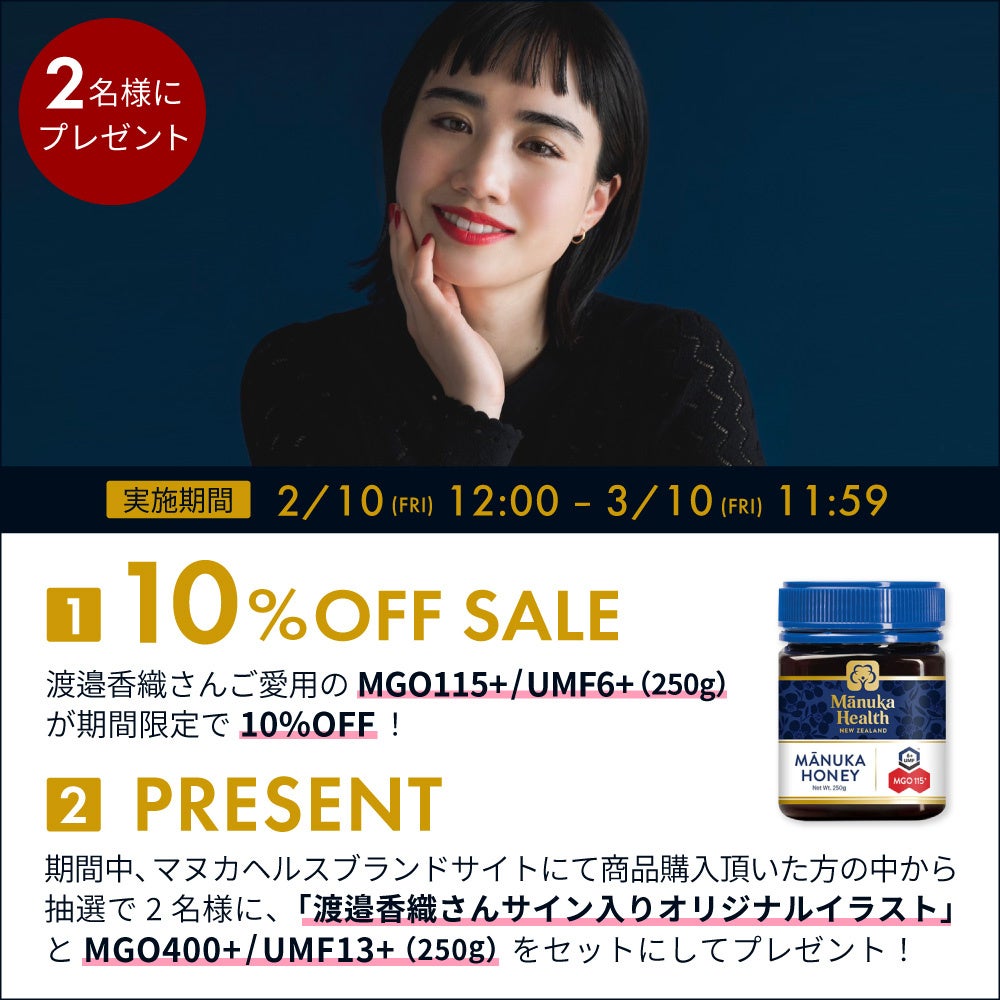 渡邉香織さんが毎朝の健康習慣にご愛用いただいていることにちなみ、期間限定で「マヌカハニーMGO115+/UMF6+(250g)」の10%割引キャンペーンを実施いたします。