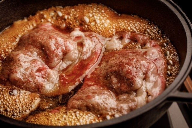 甘めに仕上げた特製の割下で煮込んだ濃厚な味わいの但馬玄リブロースのすき焼き。卵に絡めてどうぞ。