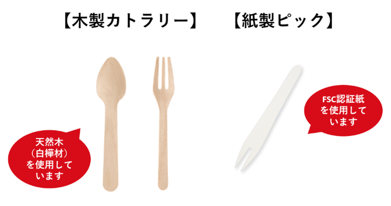 また、試飲・試食用のカップを紙製、カトラリー類を木製のものに切り替えるなど、食品との相性を考慮したうえで、可能な限りワンウェイプラスチックの削減を目指します。