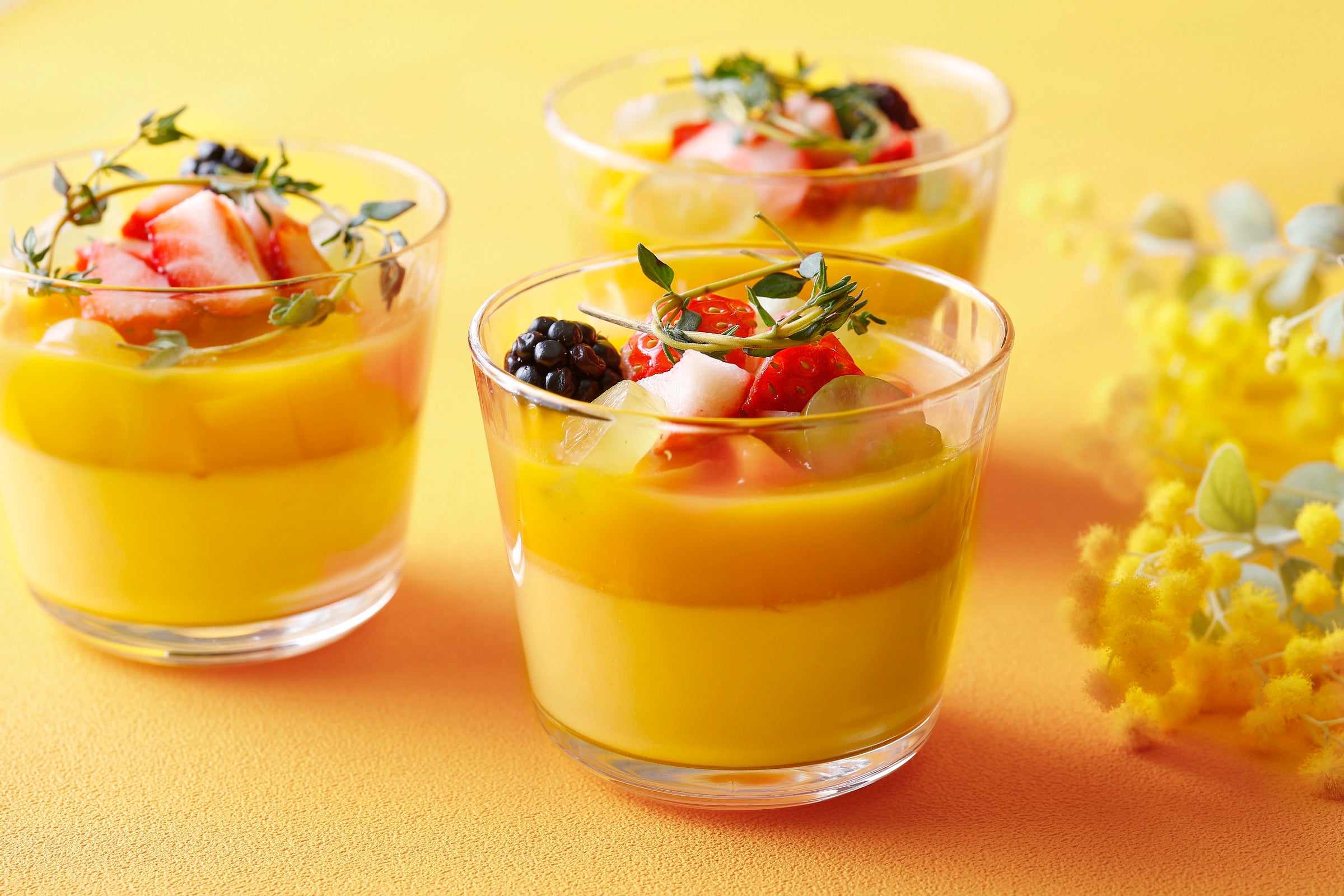 鮮やかなHAPPY YELLOWの濃厚で滑らかなマンゴープリンに、マンゴーの果肉と苺をのせ、爽やかなオレンジとマンゴーのソースをかけました。