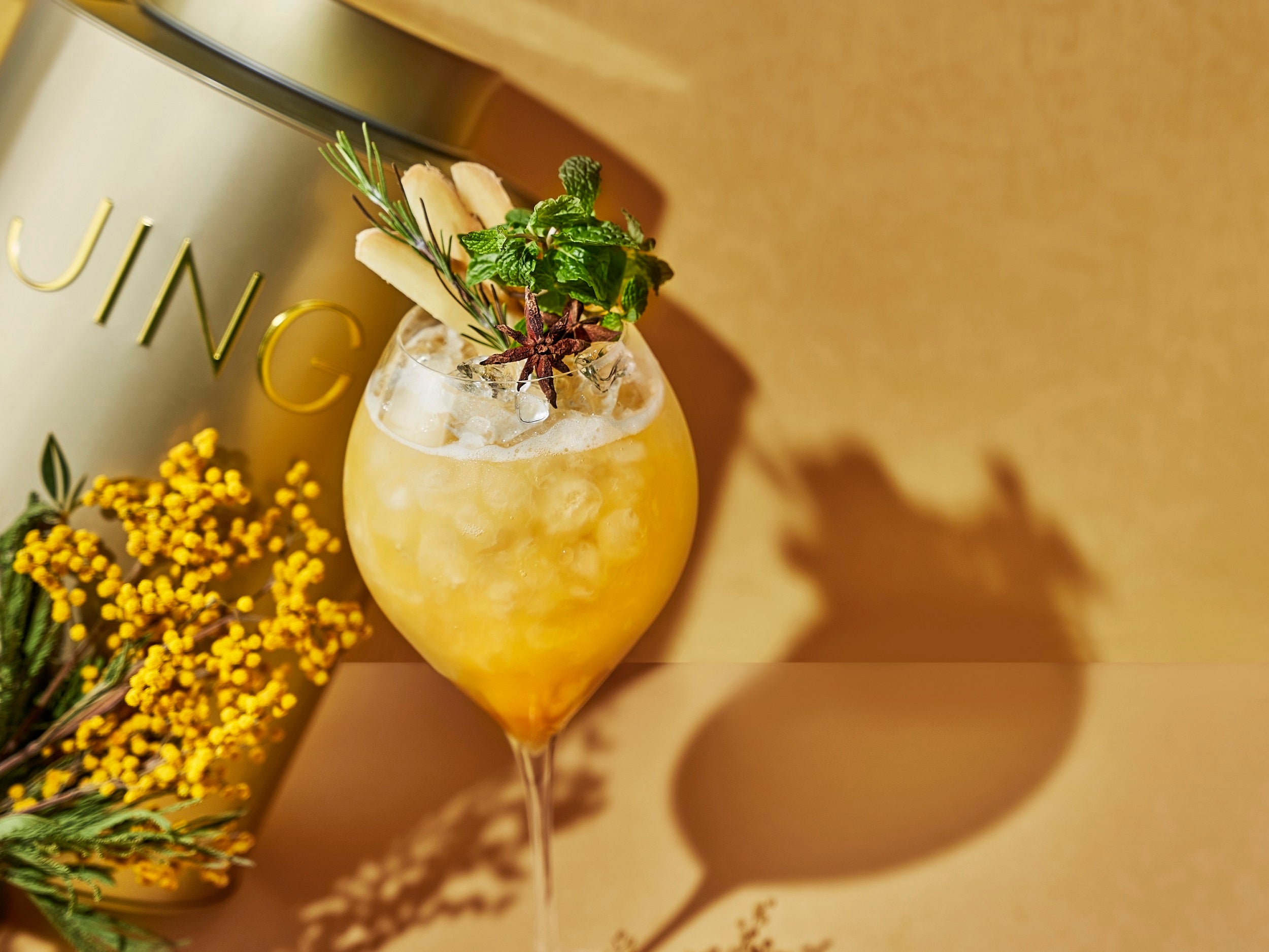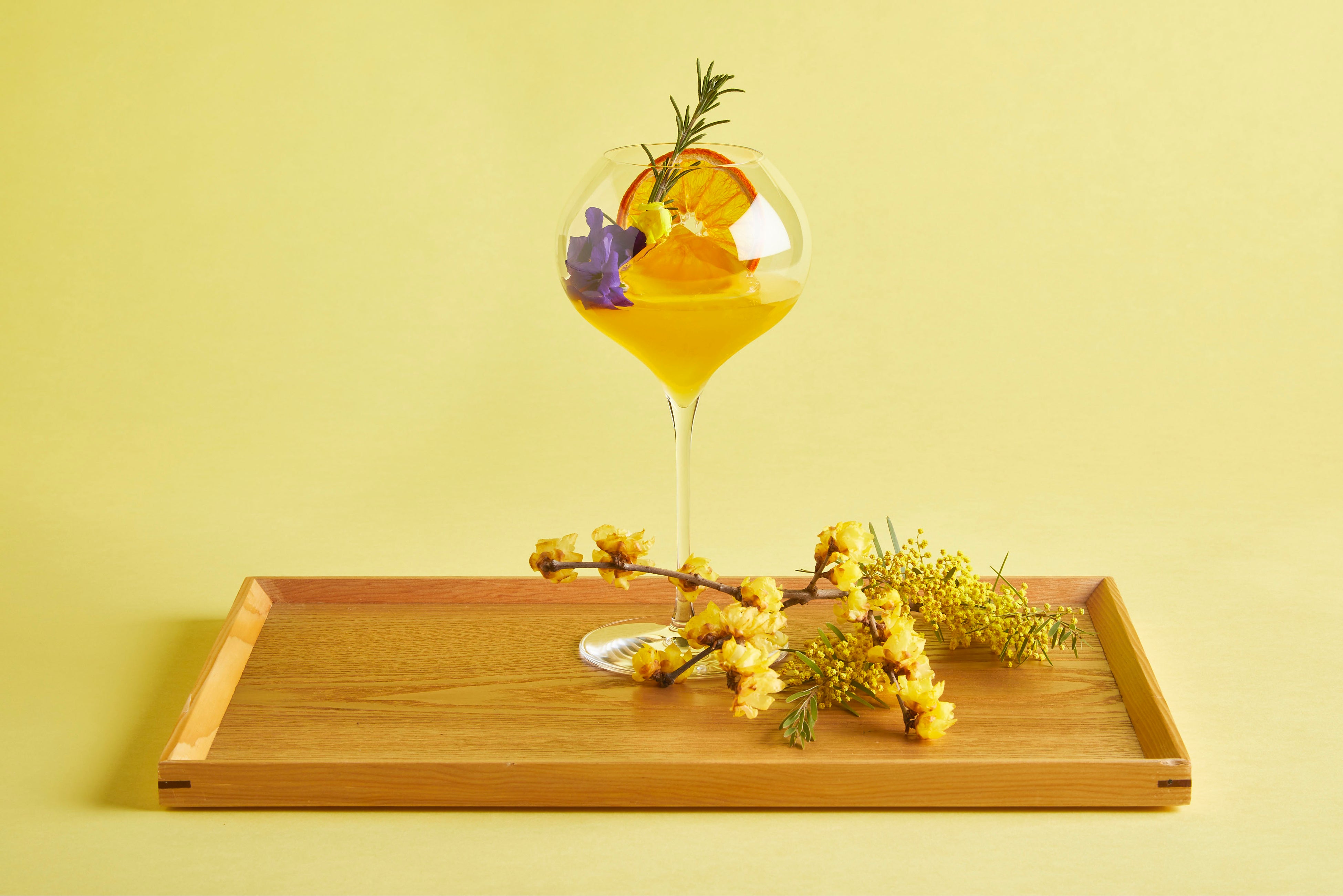 心を落ち着かせる香りのホワイトティーと、女性の体にうれしい生姜をたっぷりと使用したカクテルをご用意します。ホワイトティーのシロップ、パッションフルーツとジンジャーエールのグラデーションが黄色に輝くルックスは、希望や明るさ、いきいきとした生命力をイメージして作成。たっぷりと生姜を使用し、体の内側から温まります。トップには、スターアニスや炙ったローズマリーを添えて、非日常感を誘う香りをお届けします。一日の終わりに心と身体をほぐすカクテルです。