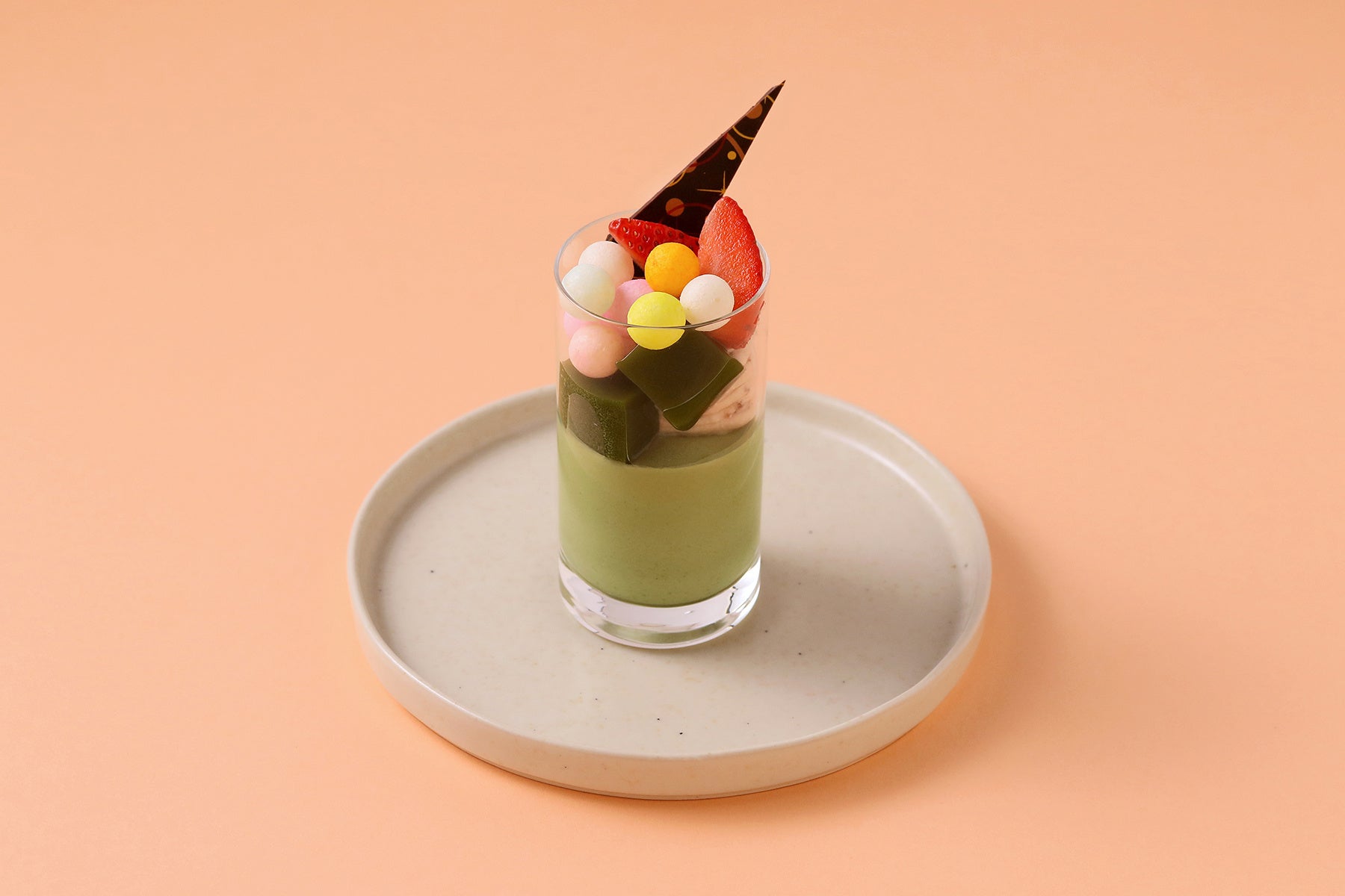 抹茶のパンナコッタに小倉のクリーム、抹茶寒天をのせ、サクフワとした食感の“おいり”※と一緒にお召し上がりください。※おいりは香川県の伝統菓子