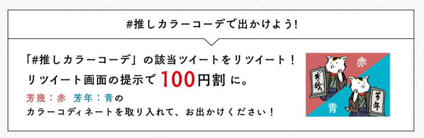 「#推しカラーコーデ」の該当ツイートをリツイートし、リツイート画⾯をチケット窓口でご提⽰頂くと100円割引となります。赤か青、あるいは赤と青、どちらでもお好きなカラーをお洋服のコーディネートに取り入れてご来場ください。