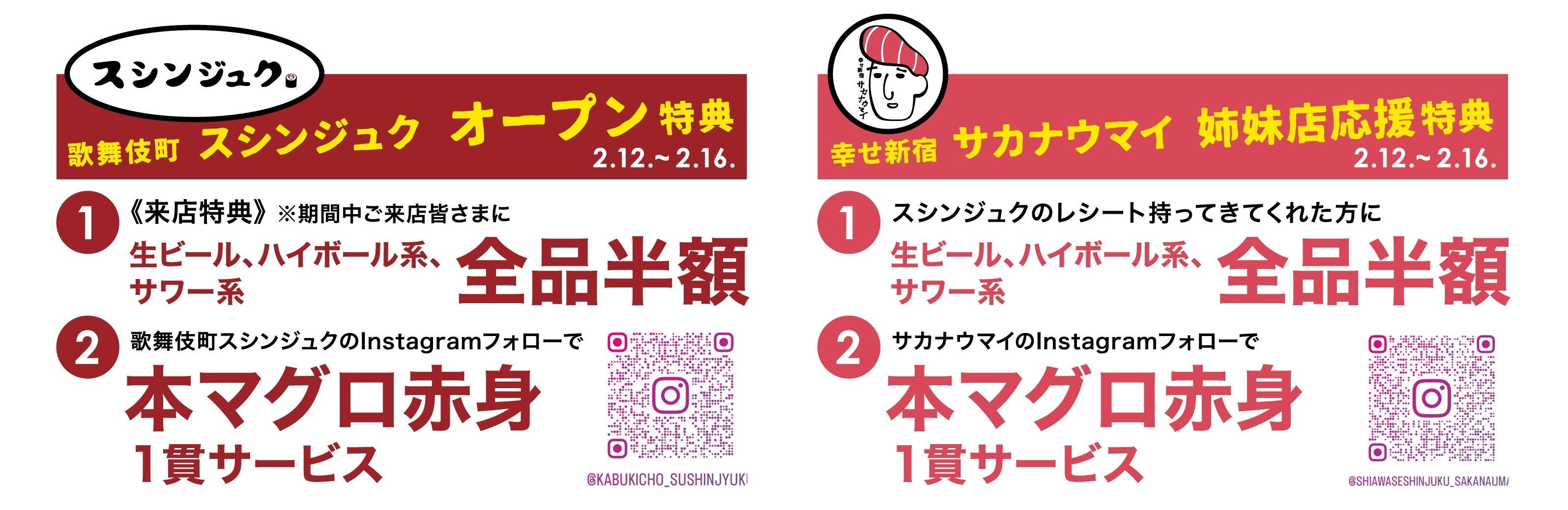 株式会社スパイスワークスホールディングス(本社:台東区 代表:下遠野亘)は、新宿ドミナント出店を狙い2023年2月12日、新宿歌舞伎町にスシンジュクを2023年2月12日オープンする運びとなりましたのでお知らせ致します。運営は2022年8月10日、同じく新宿東口に「サカナウマイ」を出店している有限会社アルバ(本社:渋谷区 代表:井上 豊)が致します。
