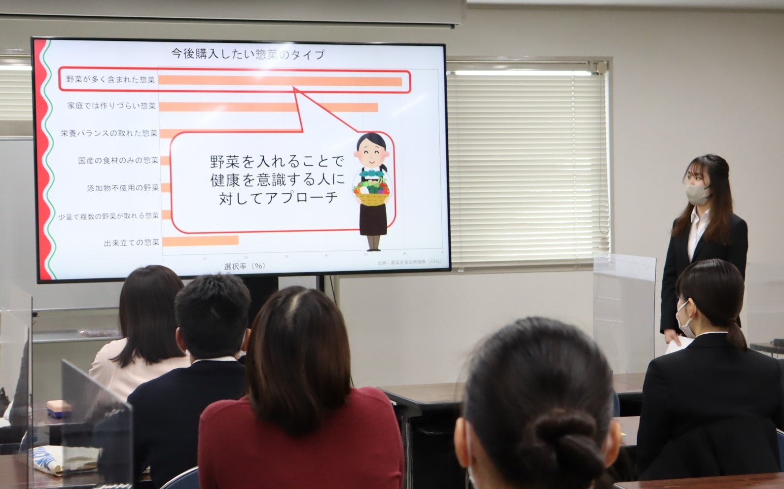 同志社女子大学食物栄養科学科食物科学専攻では、2021年4月に「食品開発プロジェクト」を開設し、学修した知識の社会での実践の場として活動しています。当社は、学生の皆さんに商品の企画から生産、発売までの開発過程の面白さを感じていただき、商品化の達成感を味わってほしいという思いから、昨年度に引き続き同プロジェクトに参加いたしました。今年度は『女子大生が食べたくなるハンバーグ』をテーマとして提示し、同プロジェクトの参加学生と共に味付けやパッケージデザイン、販売促進方法などを検討し、商品化に至りました。