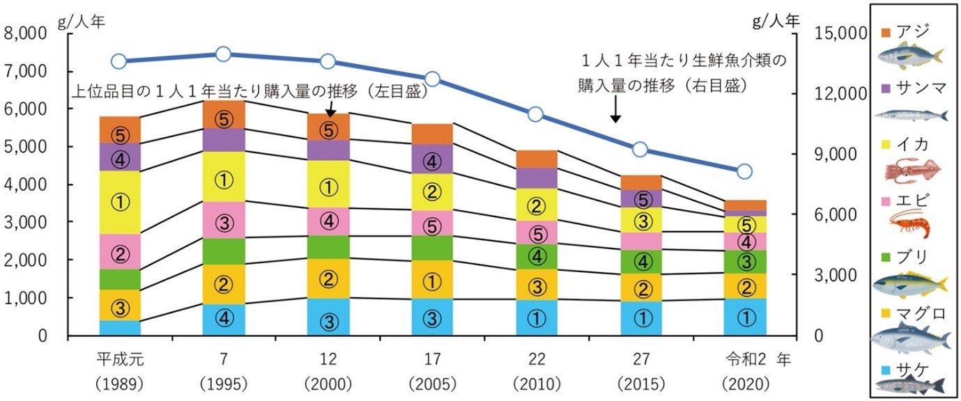 1995年をピークに日本の生鮮魚介類に対する購入量は減少傾向にあります。現在、水産事業をもう一つの基幹事業と据える当社では、魚食文化の発展に寄与するため、同時に一次産業である日本の漁業を盛り上げるために様々な施策を行っております。