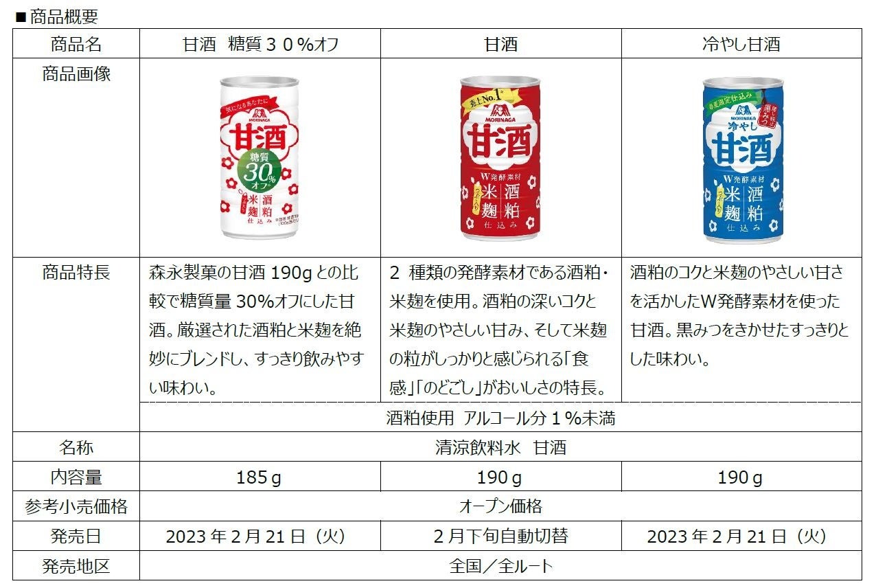 森永製菓は、1969年に瓶入り、1974年10月に缶入りの「森永甘酒」を発売。以降、古くは1300年前から飲用されてきた日本の伝統飲料である“甘酒”が、皆様の暮らしにおいて“より身近な飲み物”となるよう、様々な形態や味の甘酒の発売、甘酒の健康価値の研究などにより甘酒需要の拡大に取り組んでまいりました。コーポレートメッセージ「おいしく、たのしく、すこやかに」のもと、森永製菓はこれからも甘酒のおいしさや健康価値を探求し、お客様のウェルネスライフをサポートしてまいります。