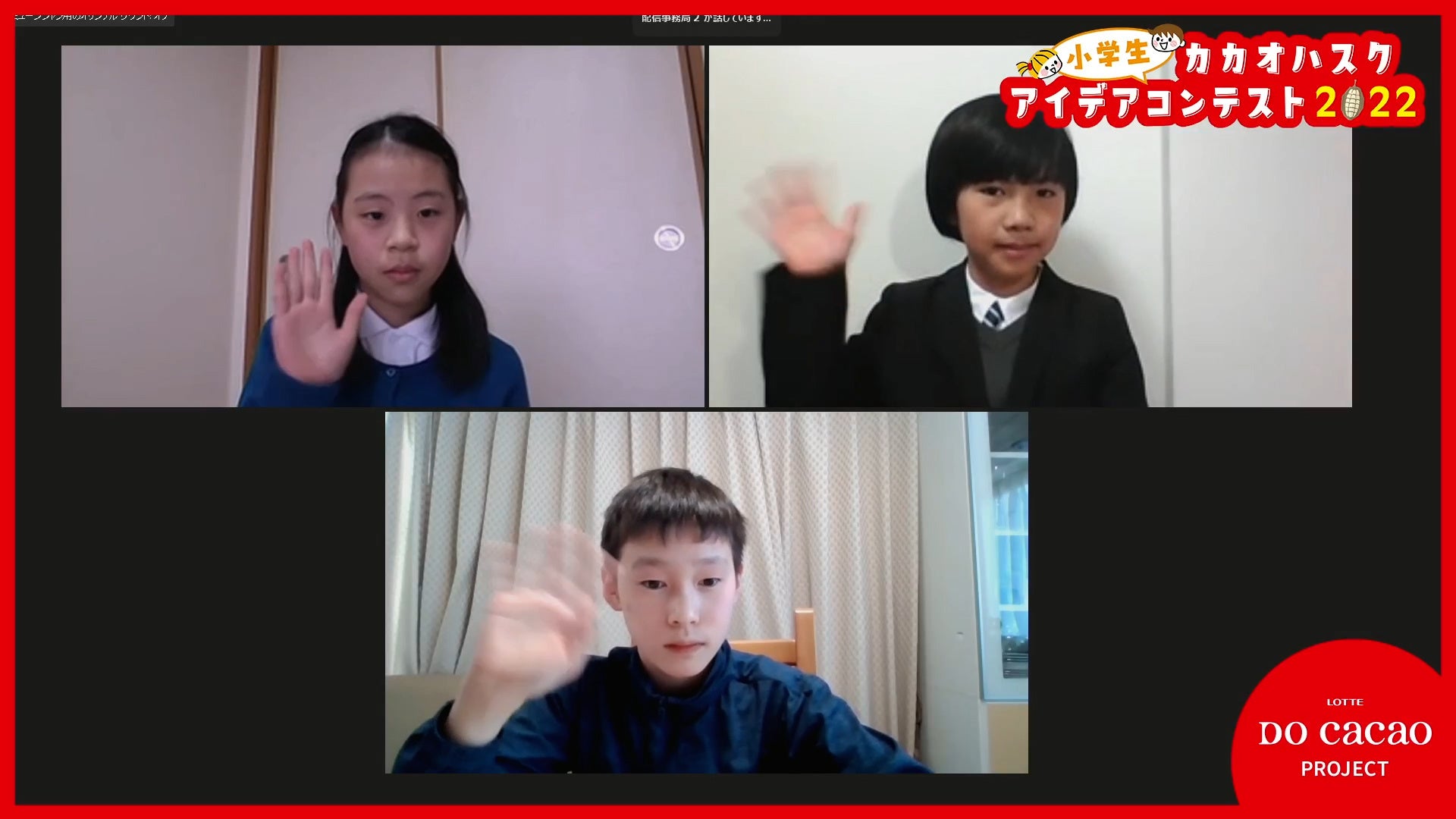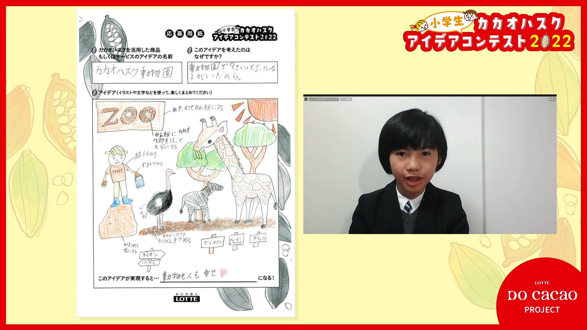審査員による厳正な審査の結果、優秀賞3名、佳作7名、学校賞1校が決定。バレンタイン直前である2023年2月11日(土)、東京都渋谷区のLOTTE DO Cacao STOREにて「小学生カカオハスクアイデアコンテスト2022」の表彰式を開催し、各受賞者はオンラインで出席しました。弊社では、カカオハスクを子どもたちの柔軟な発想で新しい素材として捉えてもらい、今までにない商品やサービスを、今後も一緒に考えていきたいと思います。