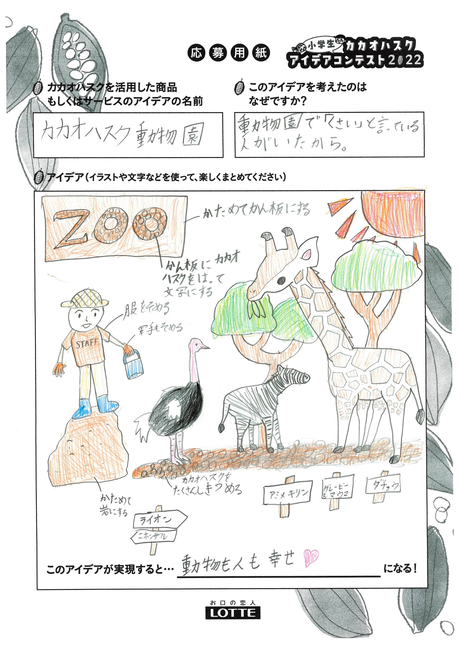 動物園好きのぼくは、「動物が臭い」と思っている人に向けて、カカオハスクの香りでその臭いを消せたらいいなと思いました。そこで、服や軍手をカカオハスクで染めたり、カカオハスクを固めて岩や看板に仕立ててはどうかと考えました。さらに動物たちがいる床にも柔らかいカカオハスクを敷いてもいいと思いました。実現すれば、動物も人も幸せになれると思いました。