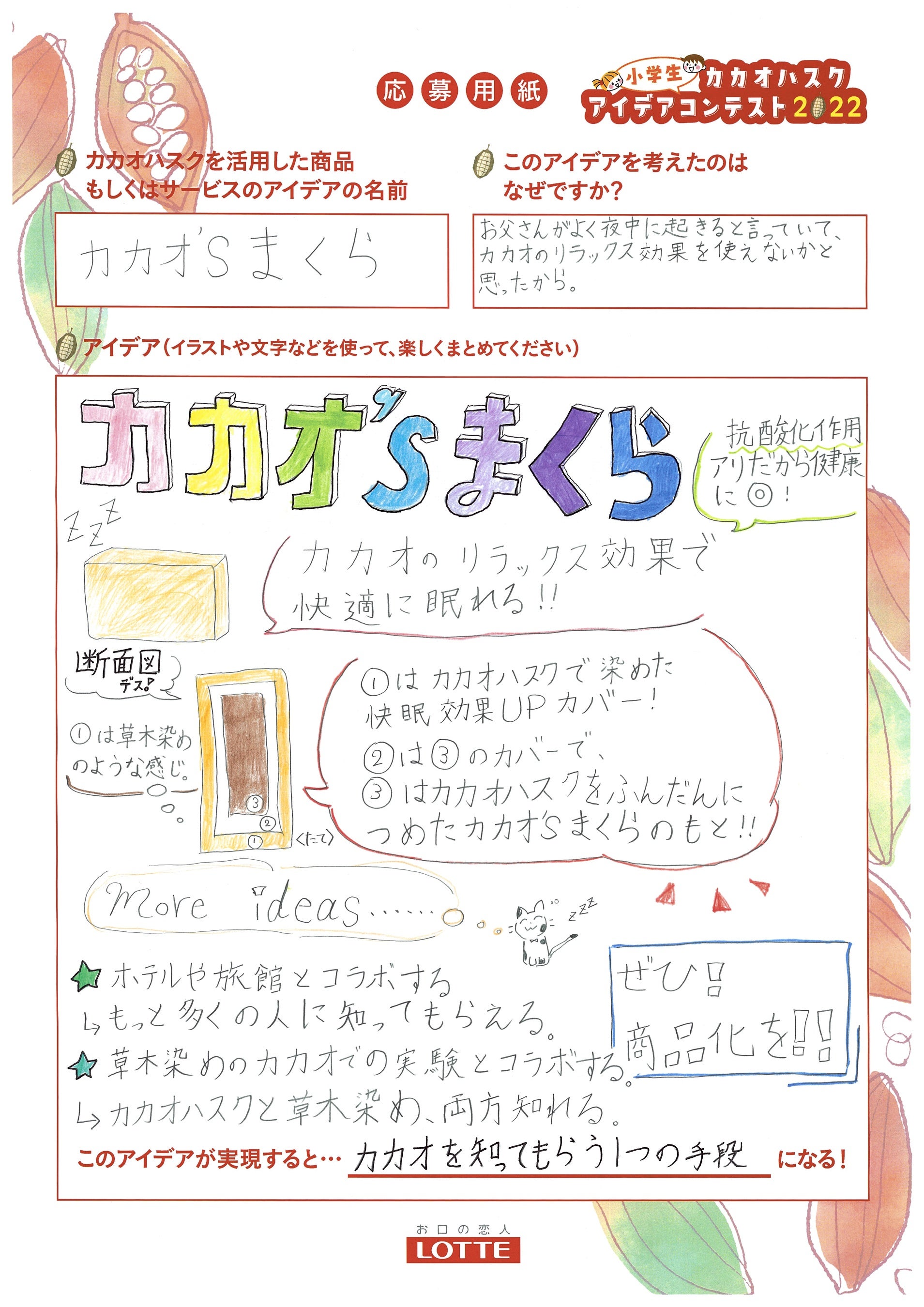 日本人の多くが睡眠に満足できていないなか、わたしは「カカオ’s まくら」を考えました。カカオハスクには、リラックス・脱臭などの効果があり、快眠へと導いてくれます。ホテルや旅館とコラボすれば、多くの人にカカオハスクを知ってもらえると思います。カカオの現状を知り、チョコレートで応援する機会が生まれればとも思っています。